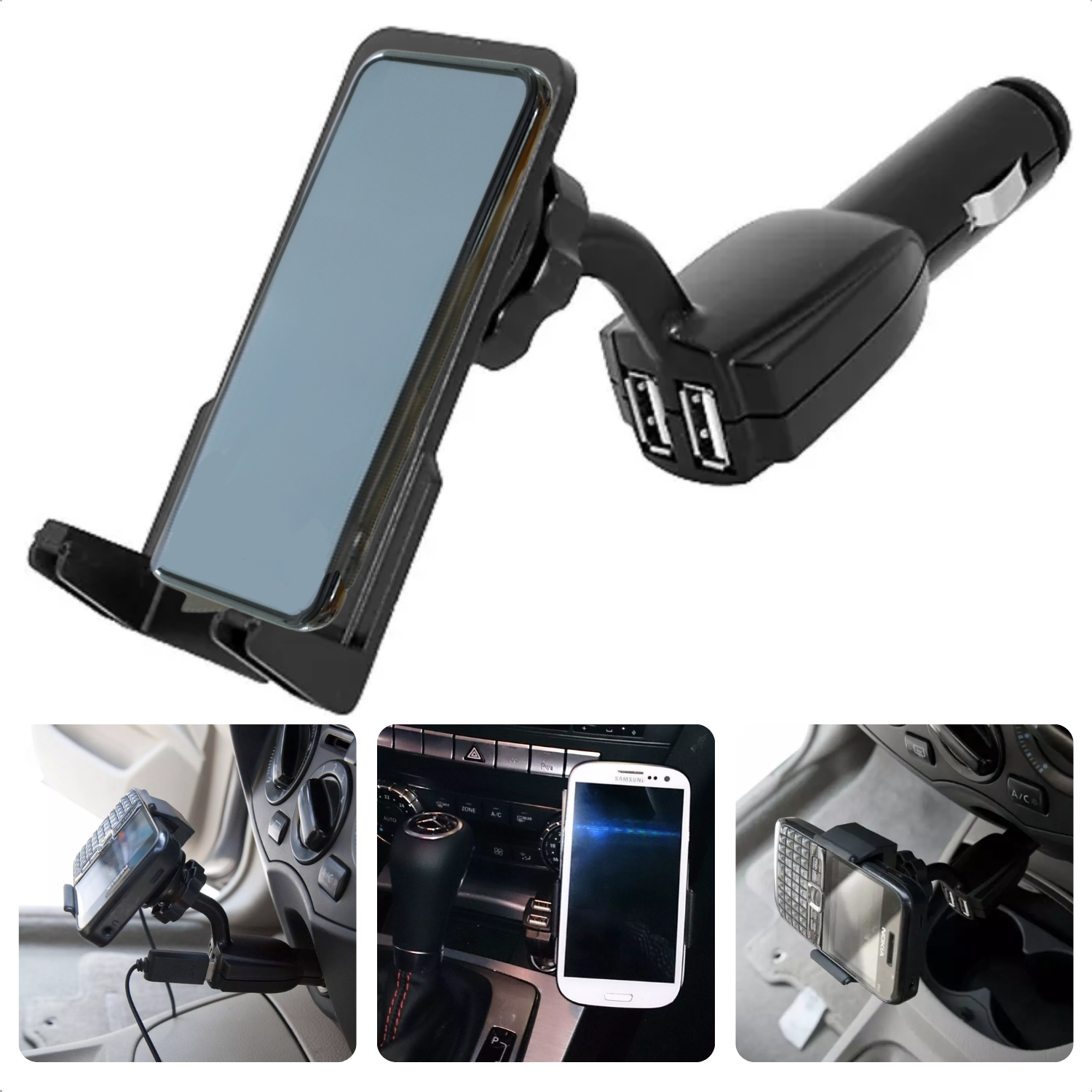 • Autolader met USB: Laad tot twee apparaten tegelijk op met de dubbele USB-poorten.