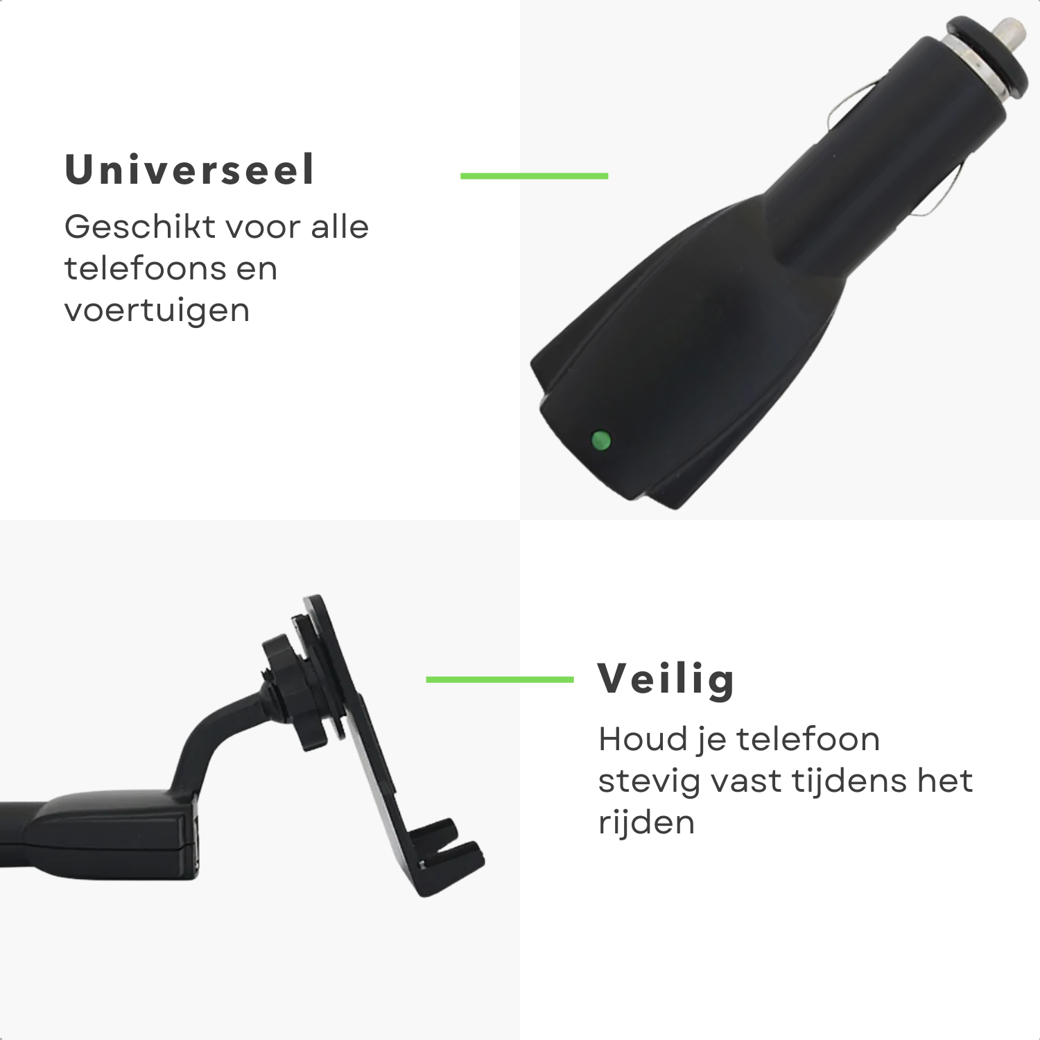 • Universeel ontwerp: Geschikt voor de meeste smartphones en voertuigen.
