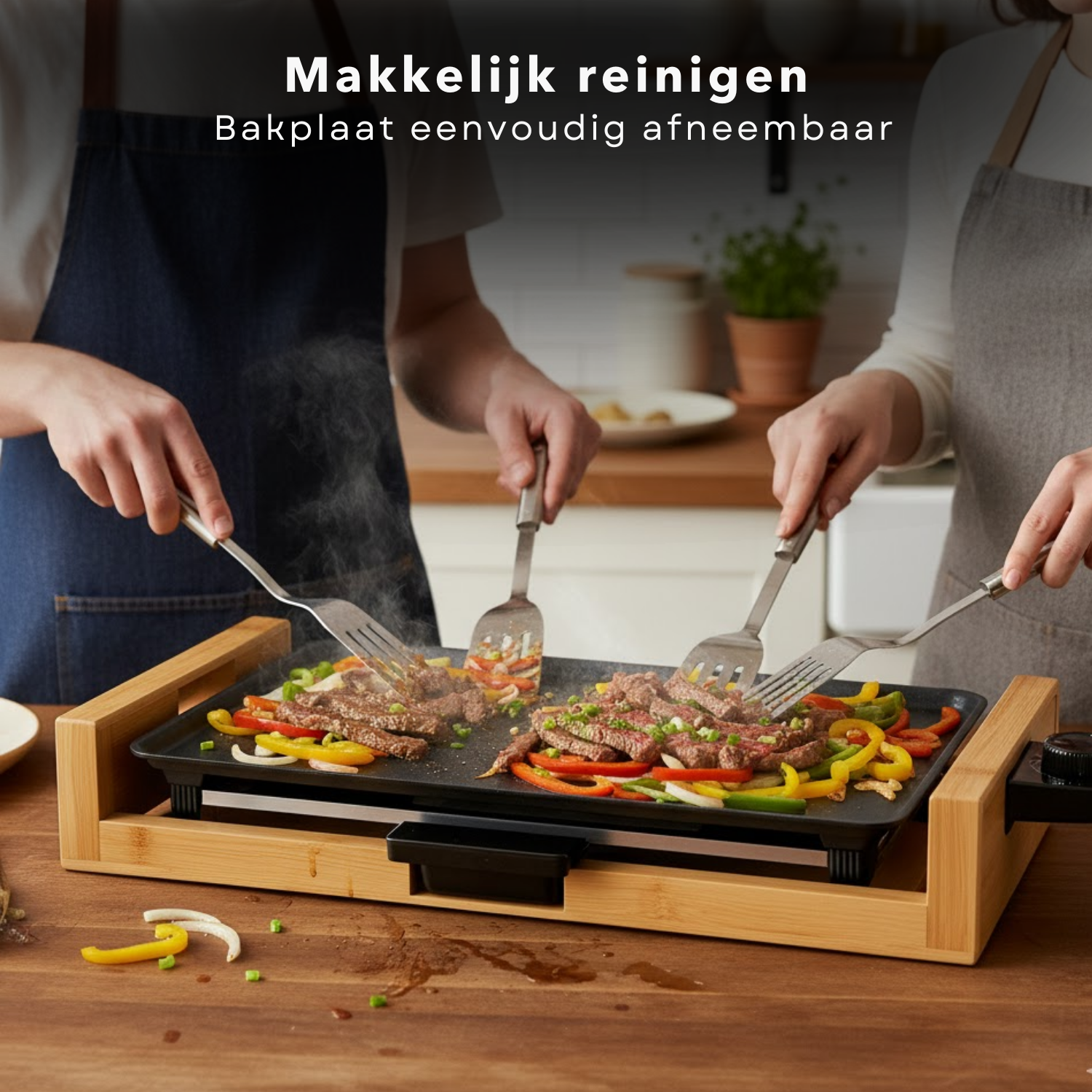 Cheqo® Teppanyaki Bakplaat - Grillplaat Grill - Elektrische Tafelgrill - Bamboe Hout - Bakplaat Kerst - Verstelbare Temperatuur - 2000W Vermogen - Tafelgrill Voor Gezin - Tepanyaki Plaat - Gourmet Grillplaat - Gourmetten Elektrisch