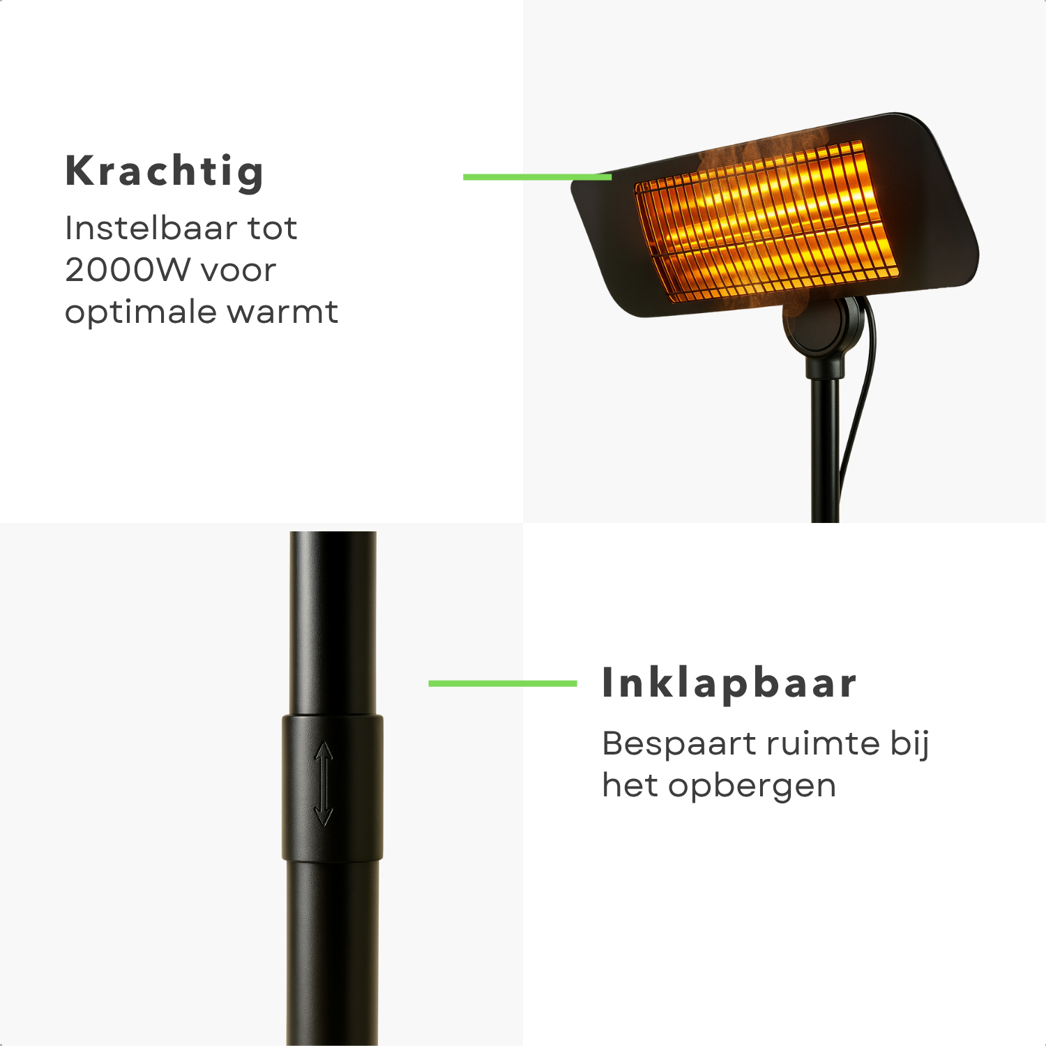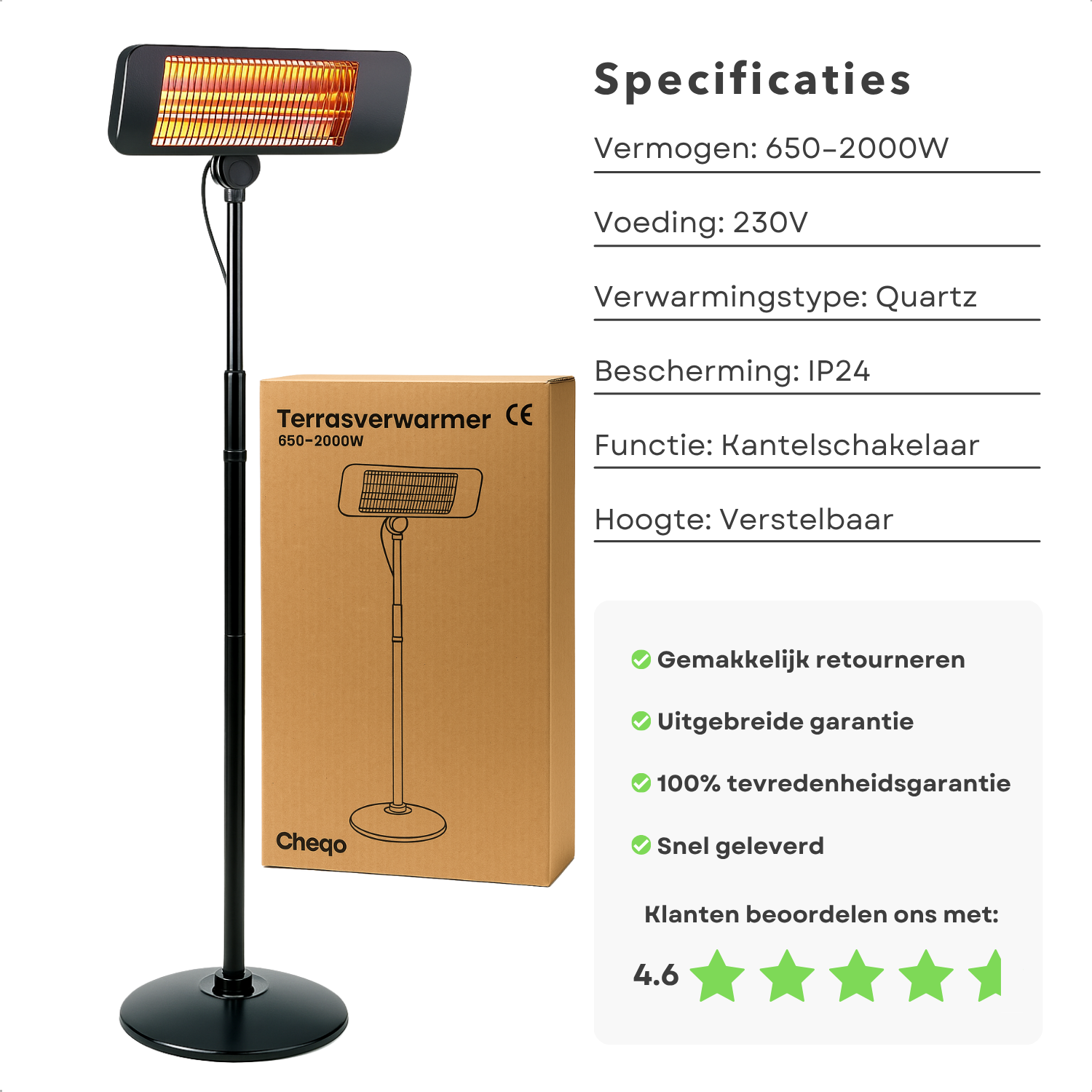 Cheqo® Terrasverwarmer Infrarood - Verstelbare Staande Heater - Elektrisch - Spatwaterdicht IP24 - Infrarood Verwarming Staand