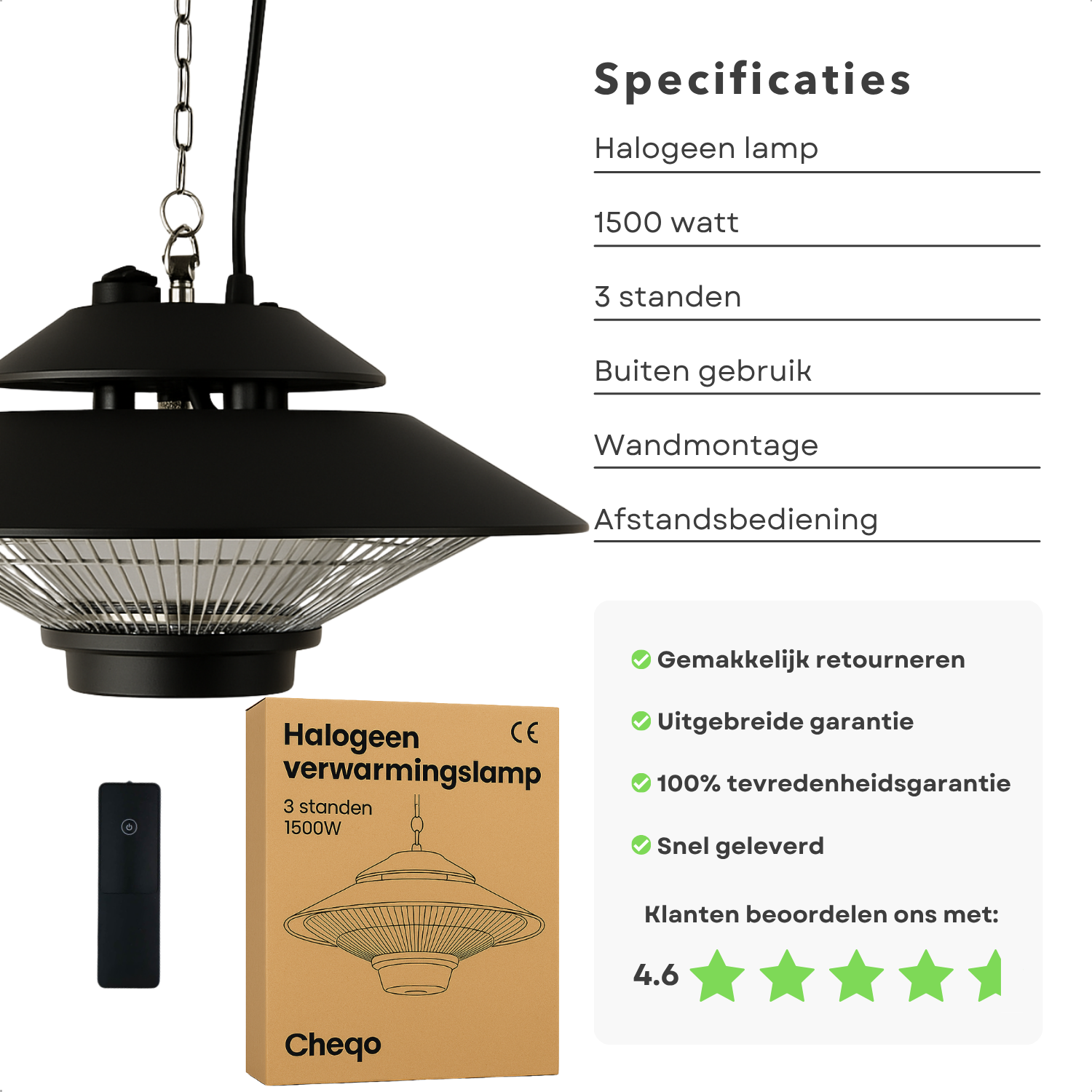 Geniet van aangename warmte op uw terras met de Cheqo® Terrasverwarmer. Deze krachtige 1500W halogeen heater is perfect voor buitengebruik... Lees meer