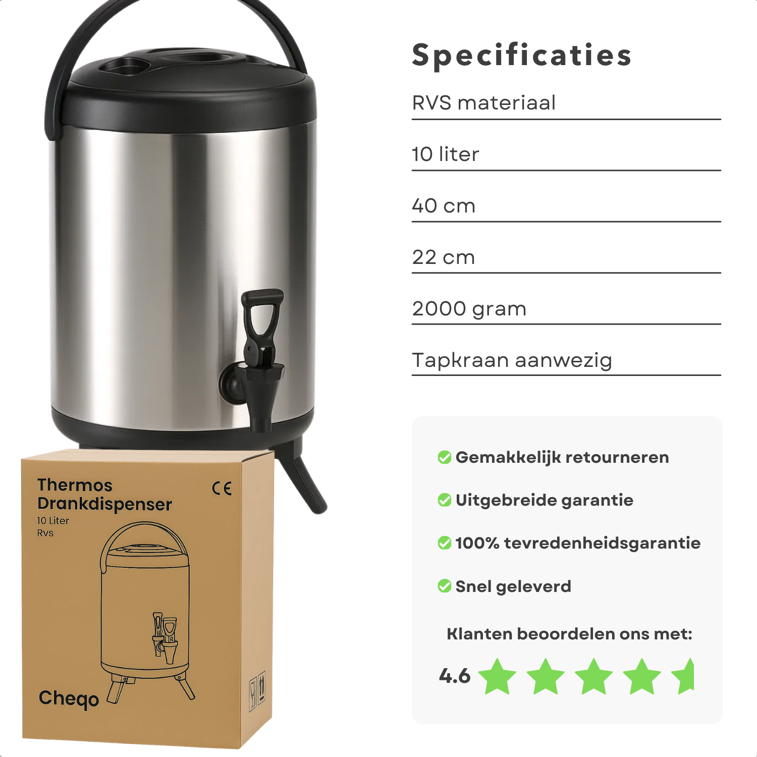 Cheqo® Thermos Drankdispenser - 10 Liter Inhoud - RVS Materiaal - Dubbelwandig Isolerend - Warme En Koude Dranken - Tapkraan - Opklapbare Pootjes - 40 cm Hoogte - 22 cm Diameter - Thermoskan - Drank Serveren