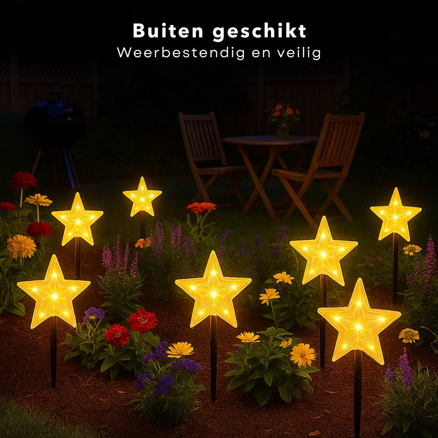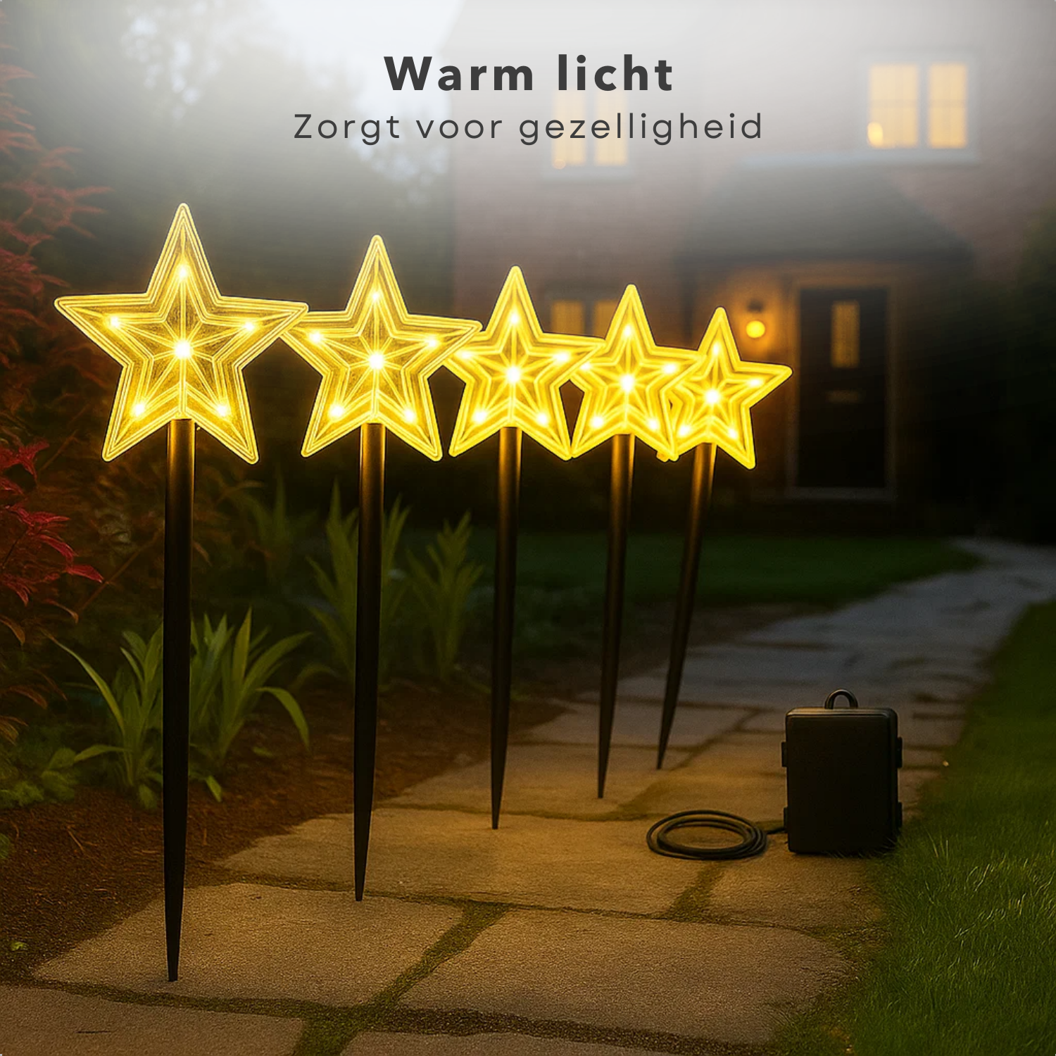 Cheqo® Tuinsteker Kerstster - LED Tuinstekers - Kerstverlichting Buiten - Set Van 5 - Met Timer - Op Batterijen - Warm Wit Licht - Acryl Kerstster - Kunststof Grondpen - IP44 Geschikt Voor Buiten - Automatische Timer - 8 Uur Aan 16 Uur Uit