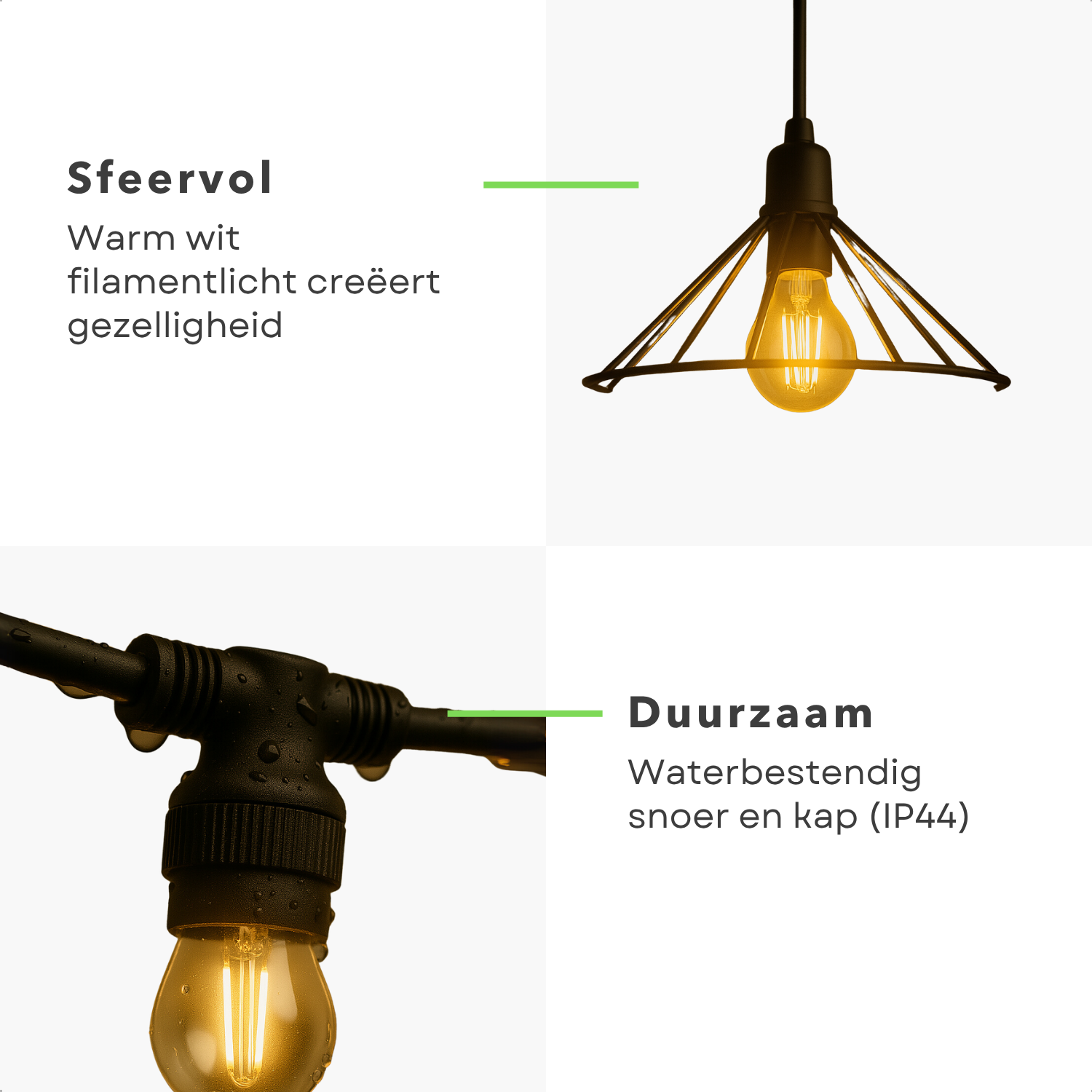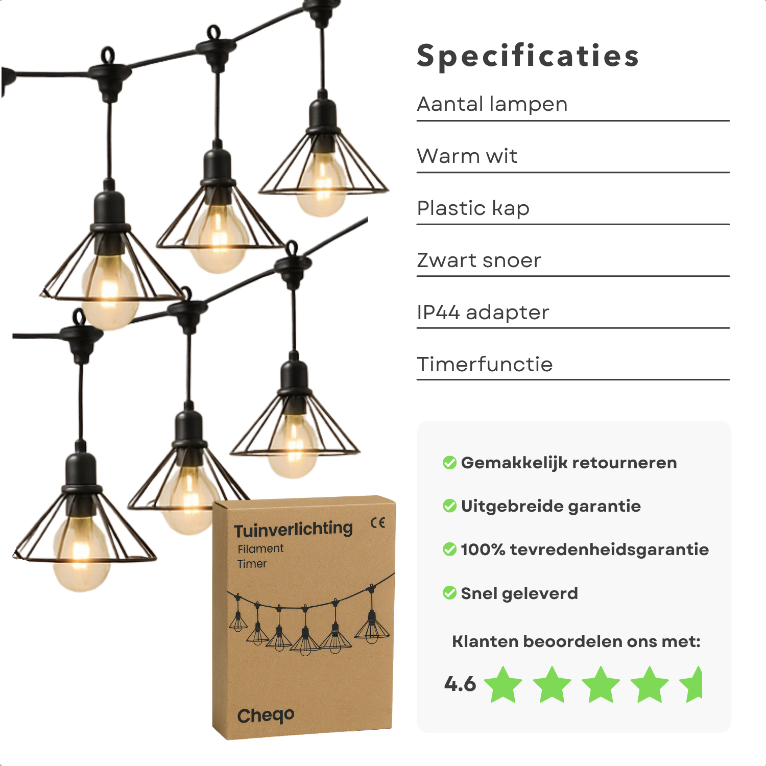 Verlicht uw tuin met de stijlvolle en functionele Cheqo® tuinverlichting. Dit lichtsnoer met 6 LED filament lampen biedt een warme,... Lees meer