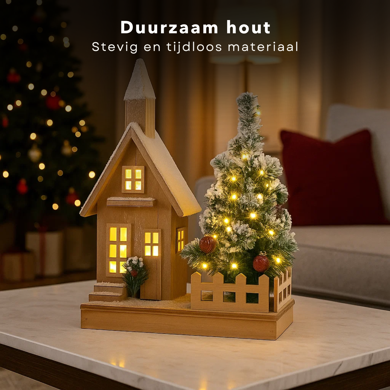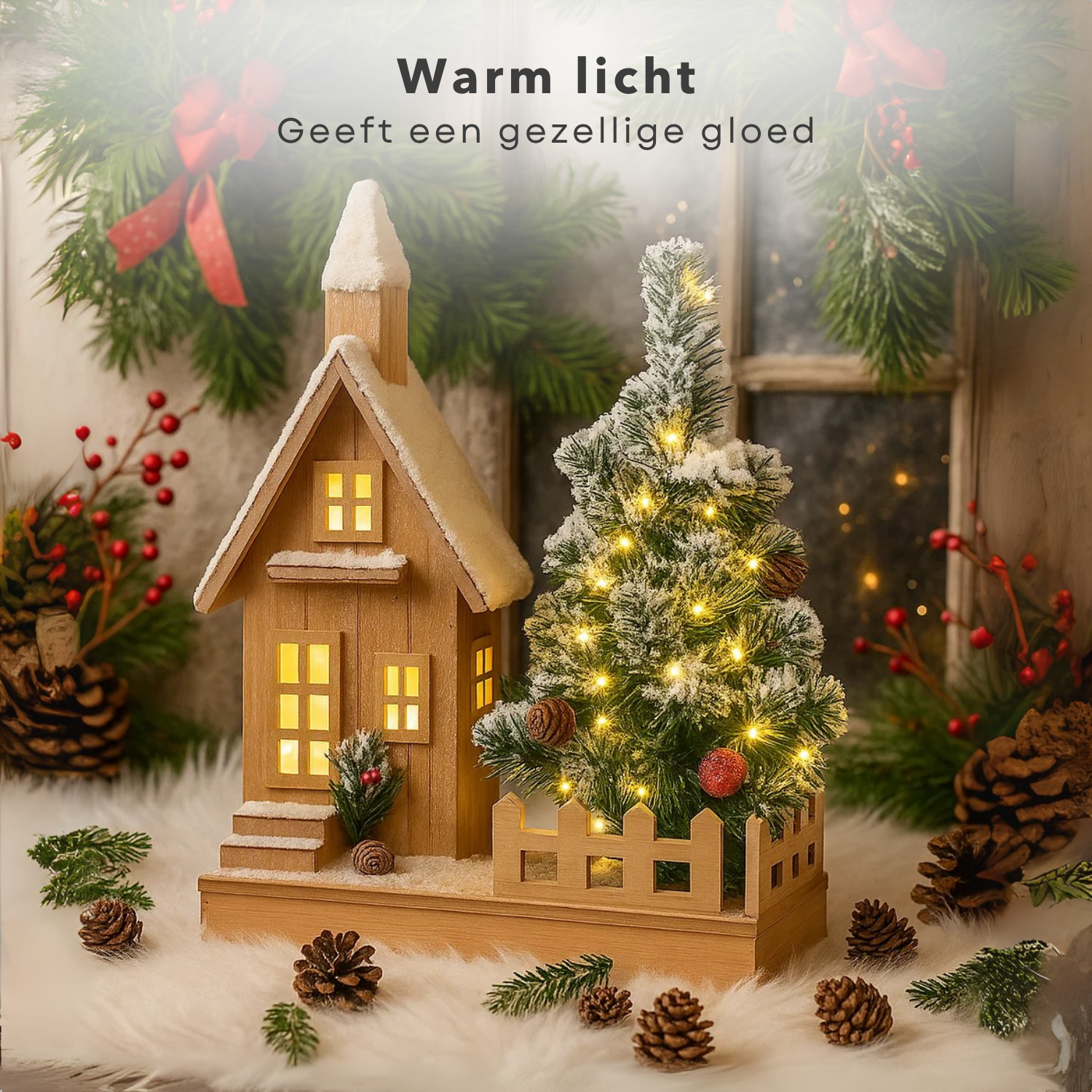 Cheqo® Verlicht Kersthuisje - Kersthuis met LED Verlichting - Warm Wit - Werkt Op Batterijen - Houten Kersthuis - Kerstdecoratie - Kersthuisjes En Kerstdorpen - Aanloopsnoer - Kerstornament Kerstdorp - Sfeerverlichting - Winterdecoratie