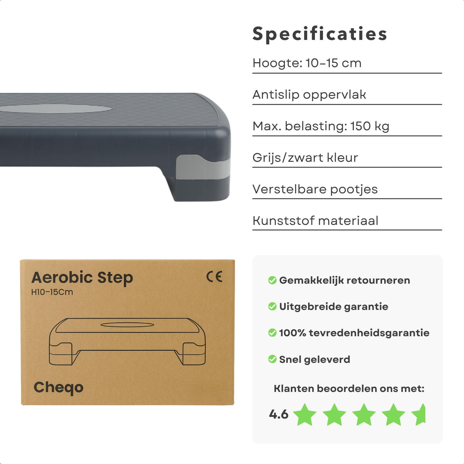 Cheqo® Verstelbare Aerobic Step 10-15 cm – Fitness Stepper met Anti-Slip Laag – Stepbank voor Thuis en Sportschool – Step Aerobics – Krachttraining & Conditietraining – Draagvermogen 150 kg – Opstapbankje