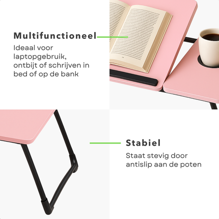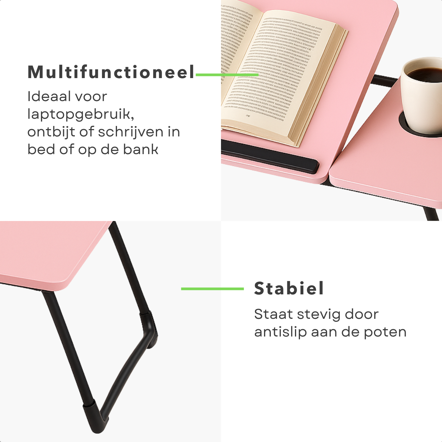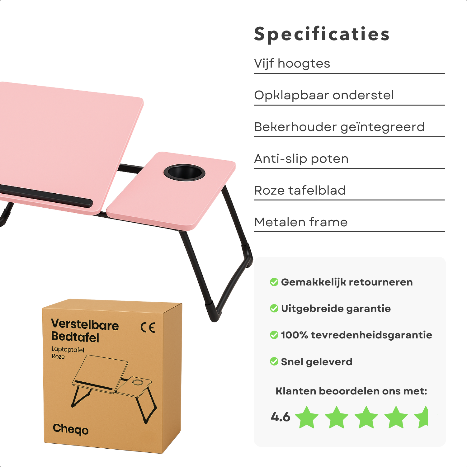 Cheqo® Verstelbare Laptoptafel - Laptopstandaard - Laptop Tafel - Opklapbare Bedtafel MDF - Banktafel Anti-slip - Ontbijttafel - Ontbijt op Bed Tafel - Metaal - Roze