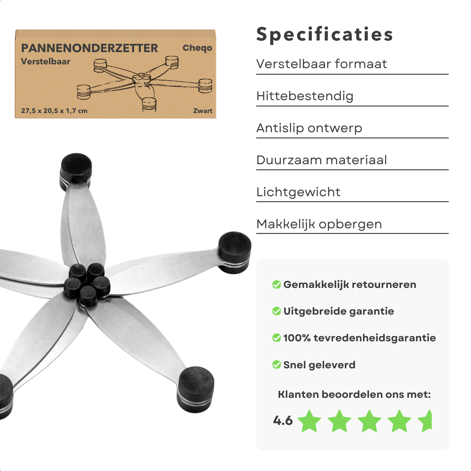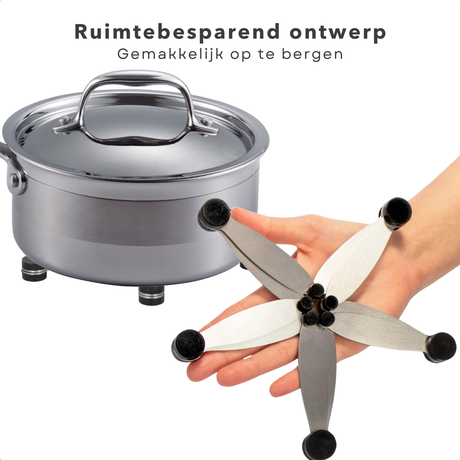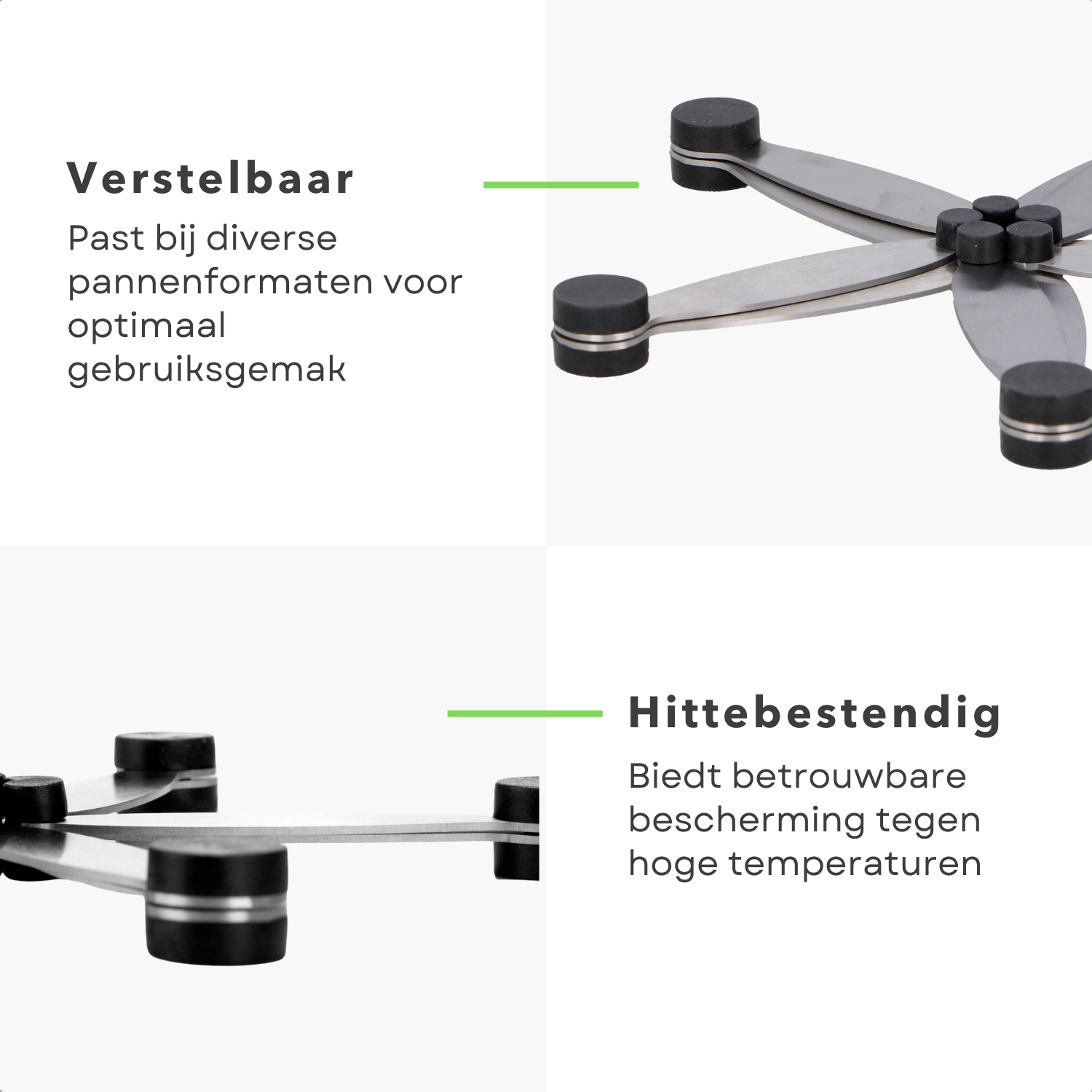 • Is de onderzetter geschikt voor alle soorten pannen?: Ja, dankzij het verstelbare ontwerp past de onderzetter zich aan verschillende pannenformaten aan.