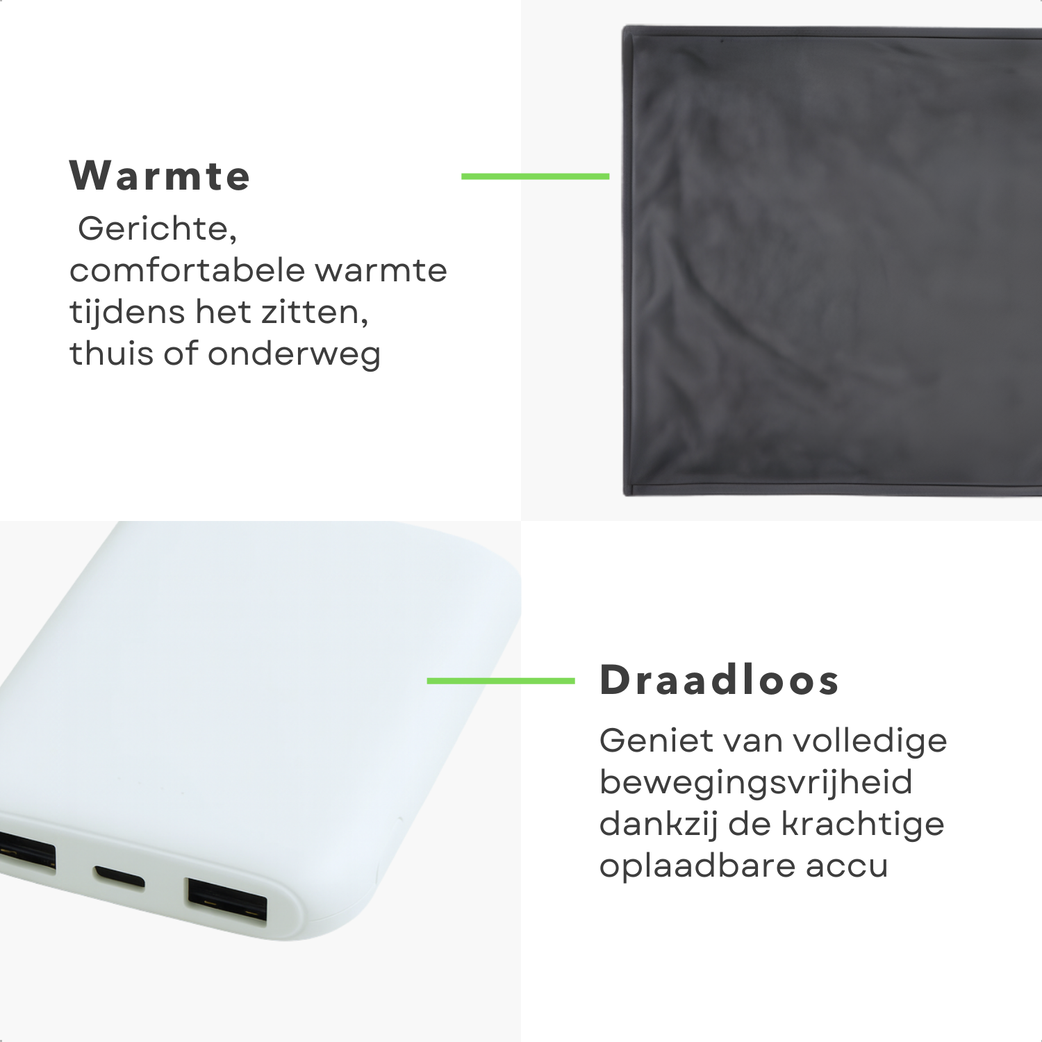 Cheqo® Verwarmd Stoelkussen - Elektrisch Kussen - Draadloos Warmtekussen - Oplaadbare Accu - Meerdere Warmtestanden - Stoelverwarmer - Stoelverwarming - Stoel Verwarming - Compact En Licht - Stoelverwarming