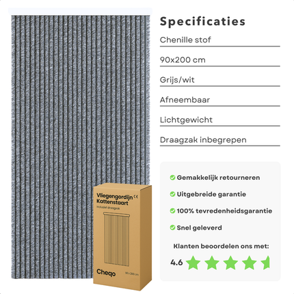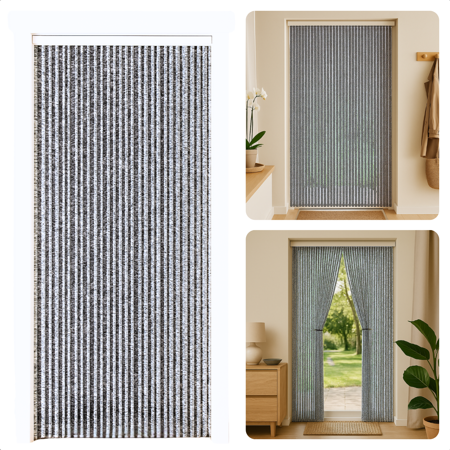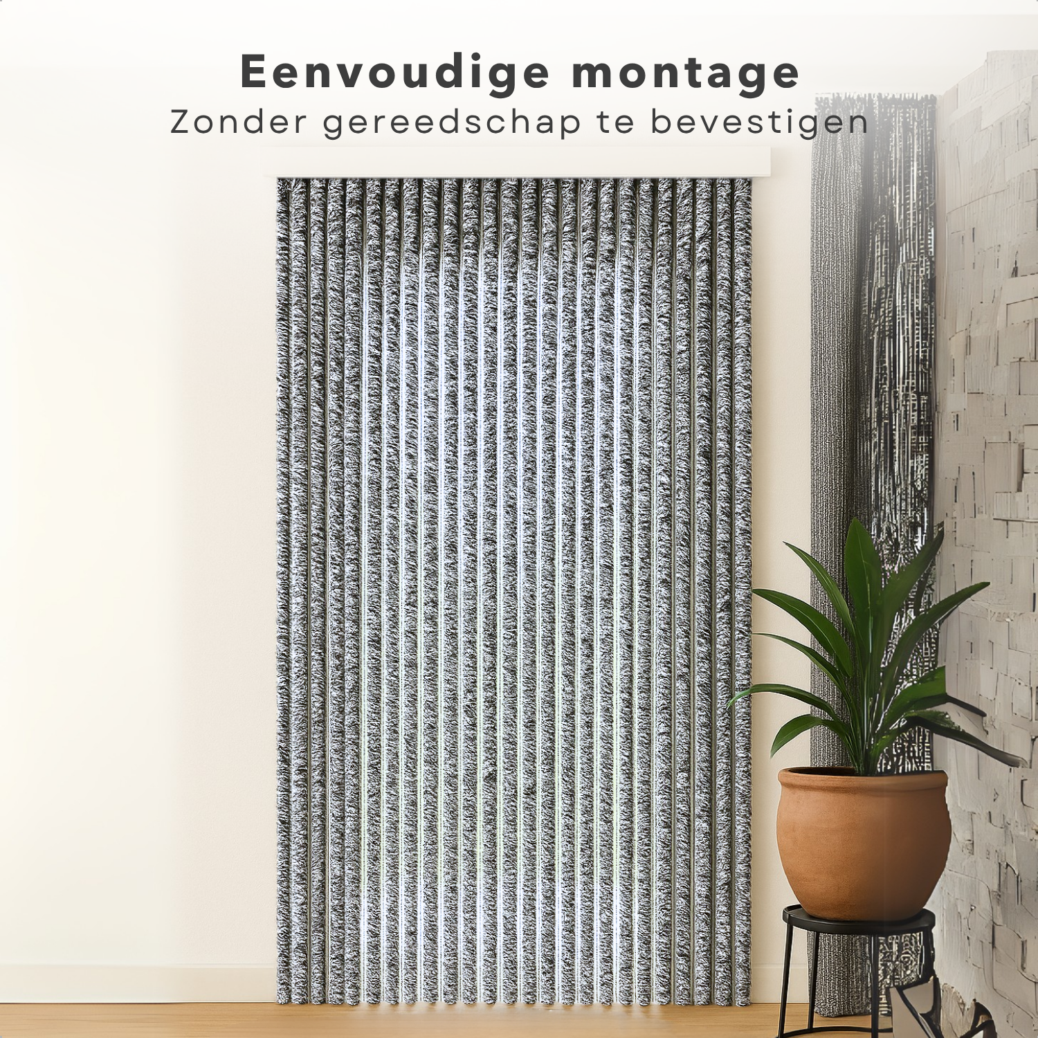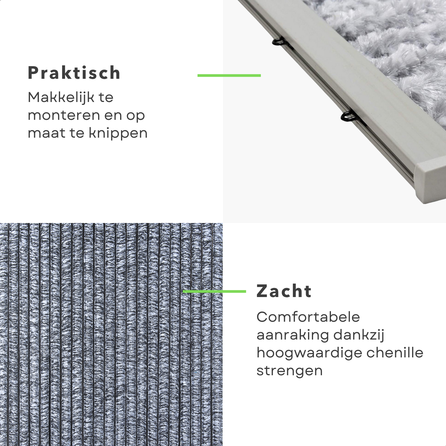 Cheqo® Vliegengordijn Kattenstaart - Deurgordijn - Vliegen Gordijn - Hordeur - Deurhor - 90x200 cm - Chenille Grijs/Wit - Voor Caravan en Thuis