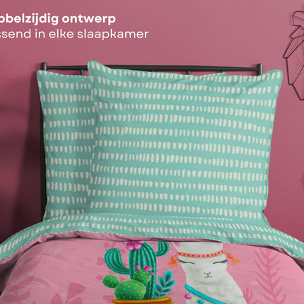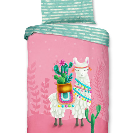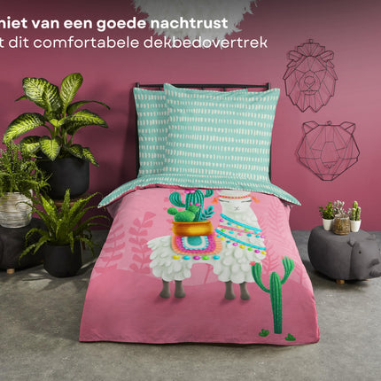 Dekbedovertrek voor Kinderen - 140x200 cm - Lama en Cactus Print - Roze - 1 Persoons - 100% Katoen