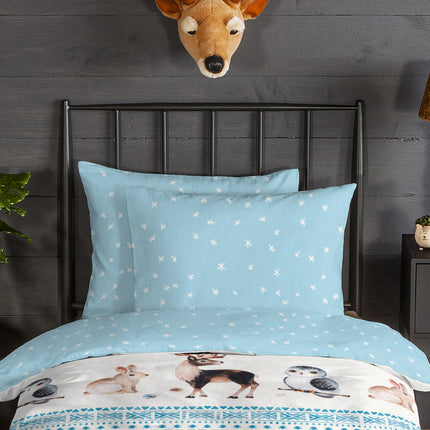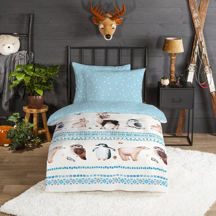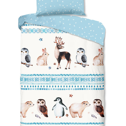 Dekbedovertrek voor Kinderen - 140x200 cm - Winterdieren en Sneeuwvlokken Print - Ice Blauw - 1 Persoons - 100% Flanel Katoen