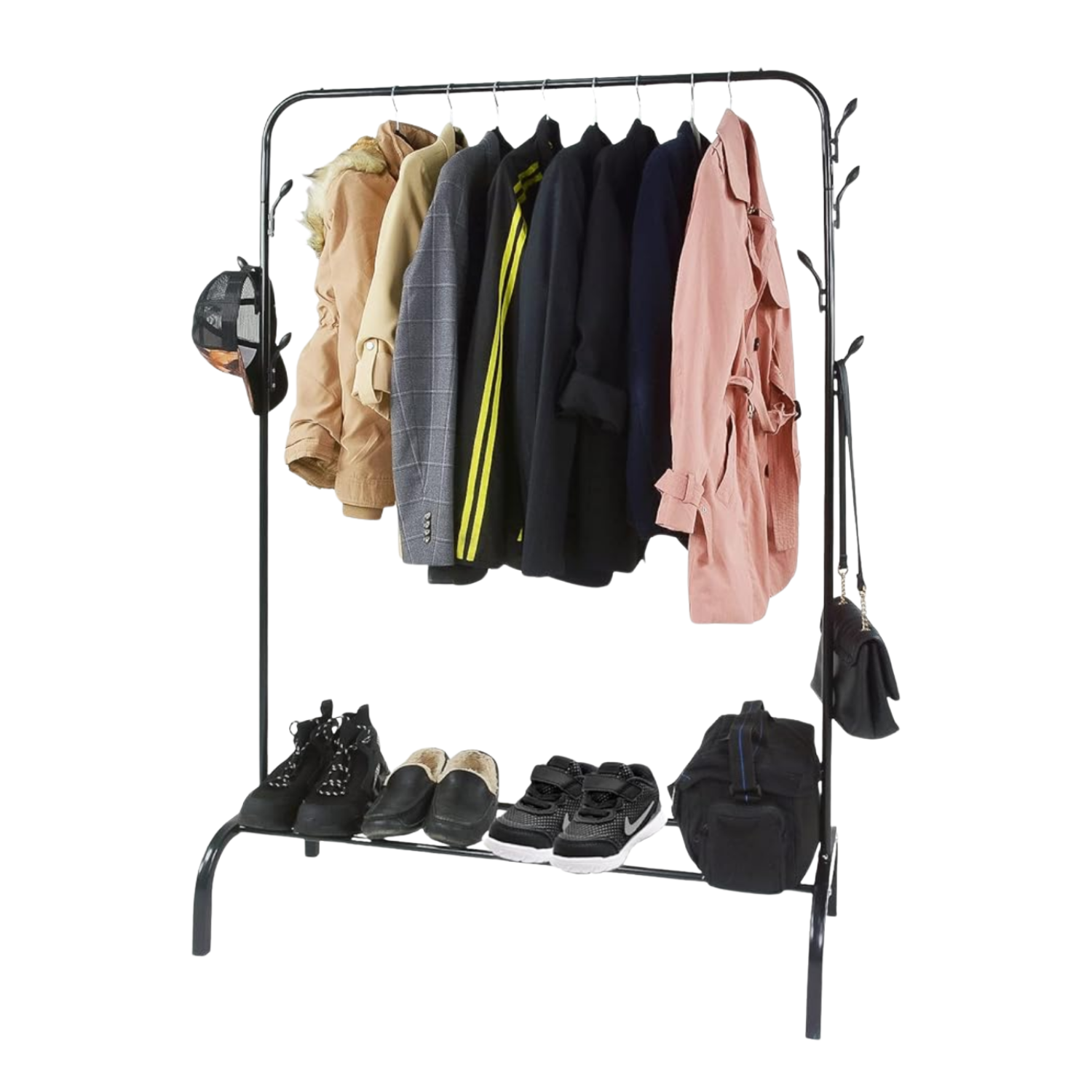 Cheqo® Garderoberek met Kapstok en Schoenenrek - Metalen Kledingrek - 110x40x150 cm - Zwart - Met Haken - Opbergruimte voor Schoenen