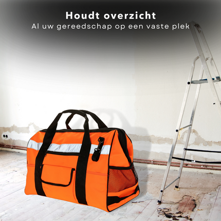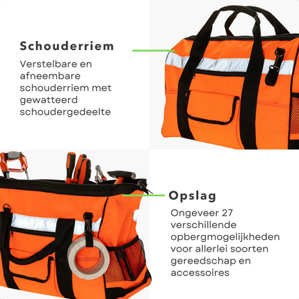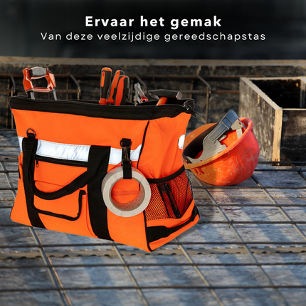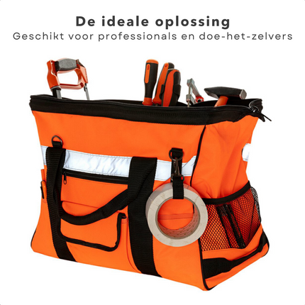 Cheqo® Gereedschapstas - Solide Neon-Oranje 600D Polyester - Reflectiestreep - 20kg Max. Draagcapaciteit - 45x29x32cm - Tapehouder - Schouderriem - 4 Noppen - 27 Opbergopties
