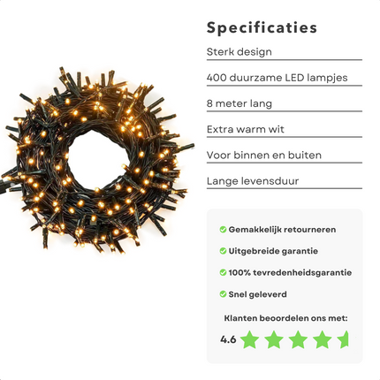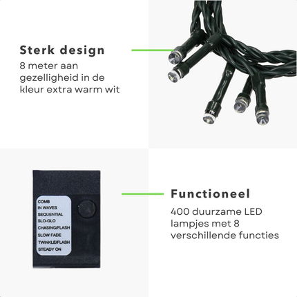 Cheqo® Kerstboomverlichting - Clusterverlichting - Kerstlampjes - Led Verlichting - Kerstverlichting voor Binnen en Buiten - 400 LED - 8 Meter - Extra Warm Wit