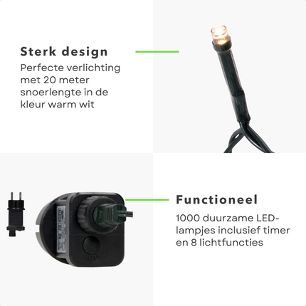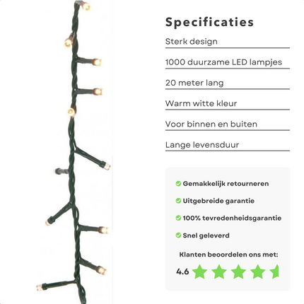 Cheqo® Kerstboomverlichting - Micro Clusterverlichting - Kerstlampjes - Led Verlichting - Kerstverlichting voor Binnen en Buiten - 1000 LED's - 20 Meter - Warm Wit