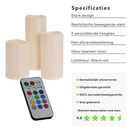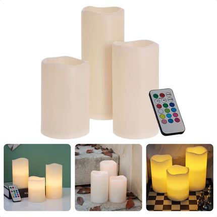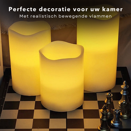 Cheqo® LED Kaarsen voor Binnen en Buiten - 3 stuks - Realistische Kaarsen - Bewegende Vlam - 15cm, 20cm, 25cm - Afstandsbediening - Timer - IP44 - Warm Wit - Met Batterijen