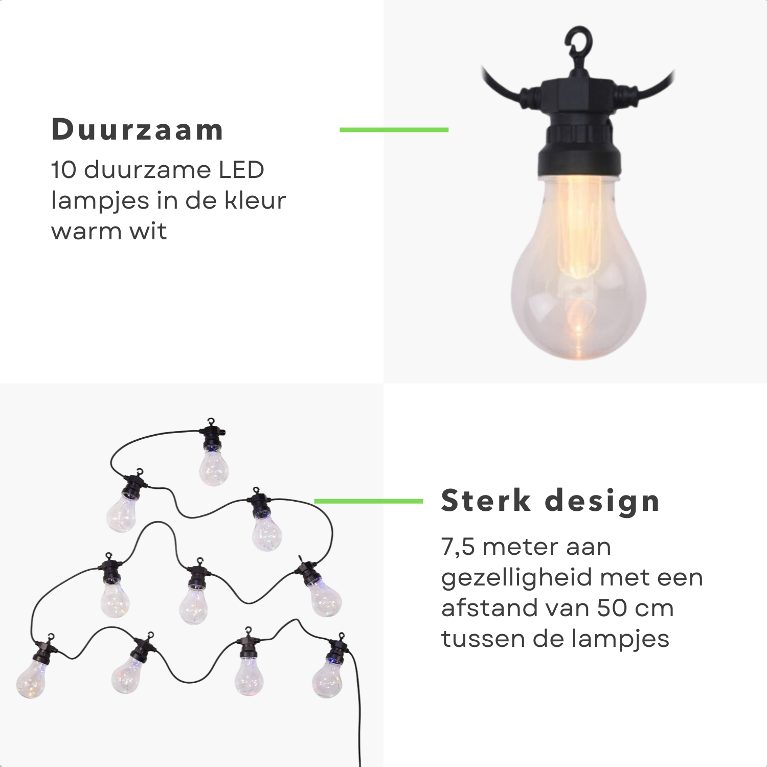 Cheqo® Lichtsnoer - Fairy Lights - Lichtslinger voor Binnen en Buiten - Kerst Verlichting - Tuinverlichting - Feestverlichting - Warm Wit - 10 LED Reflector Bolletjes - 7.5 Meter