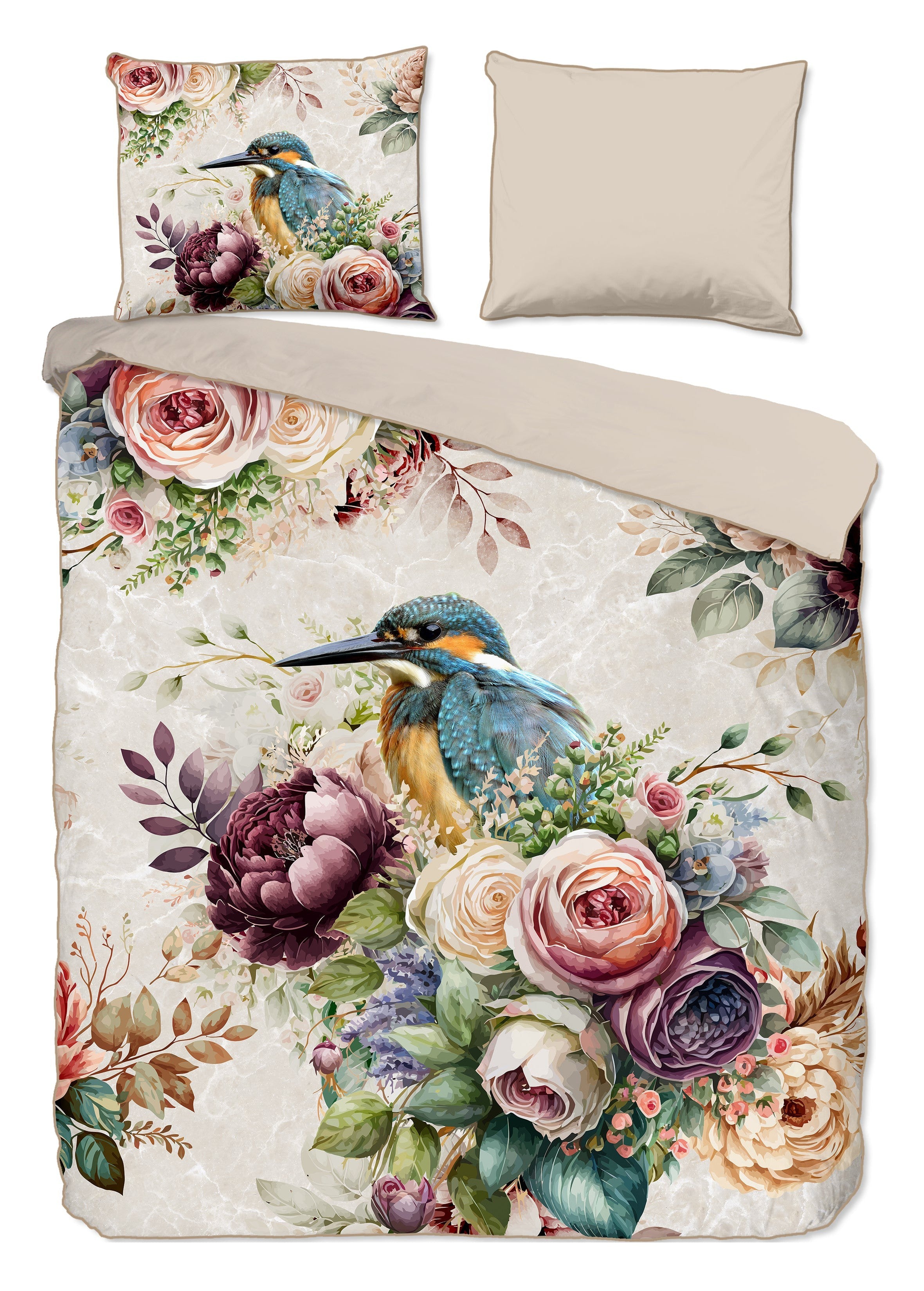 Luxe Satijnen Dekbedovertrek 200x220 cm - Bloemen en Vogels Print - Zand - 2 Persoons - 100% Katoen-Satijn