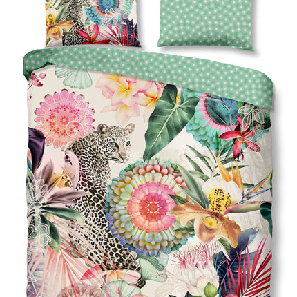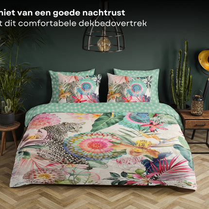 Luxe Satijnen Dekbedovertrek 240x220 cm - Tropische Bloemen en Luipaard Print - Multicolor - 2 Persoons - 100% Katoen-Satijn