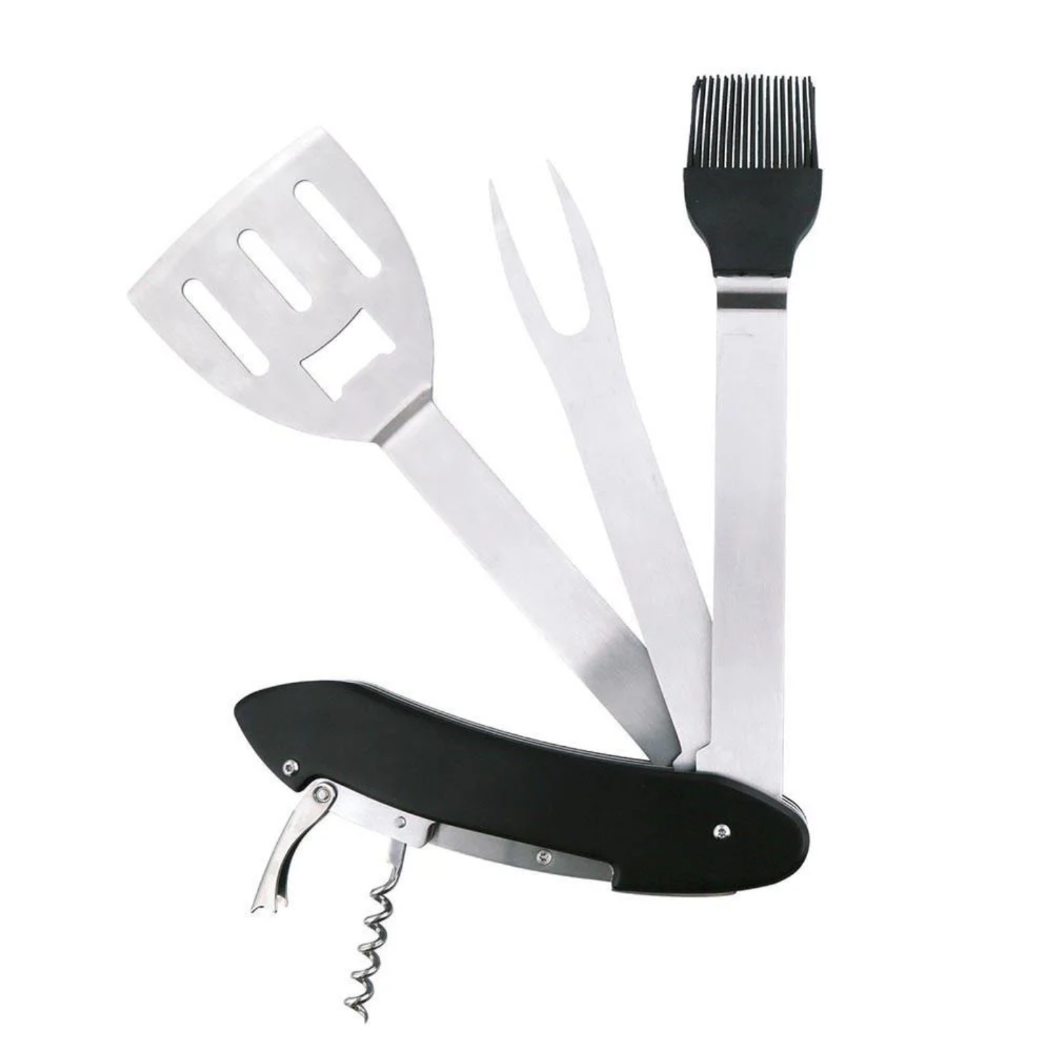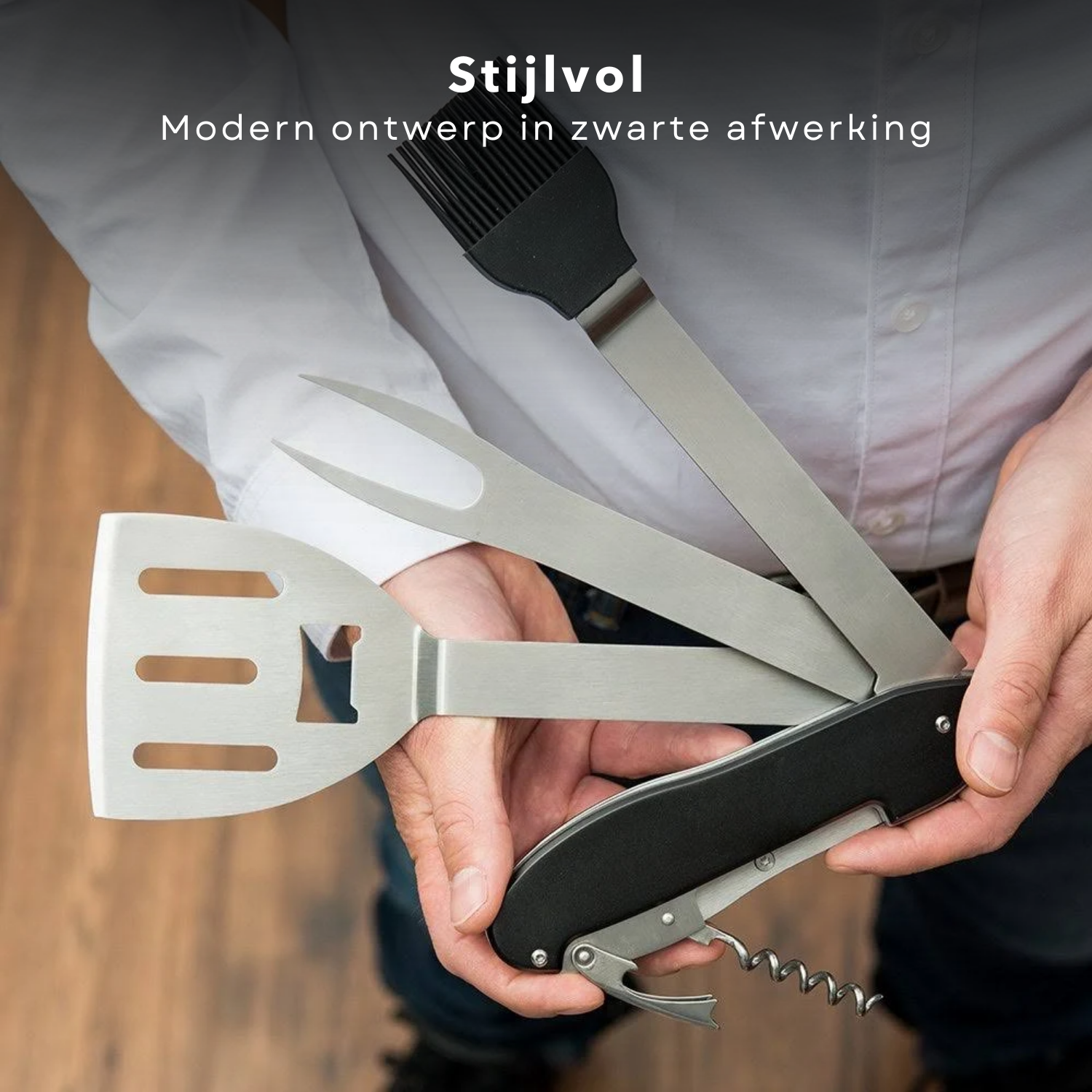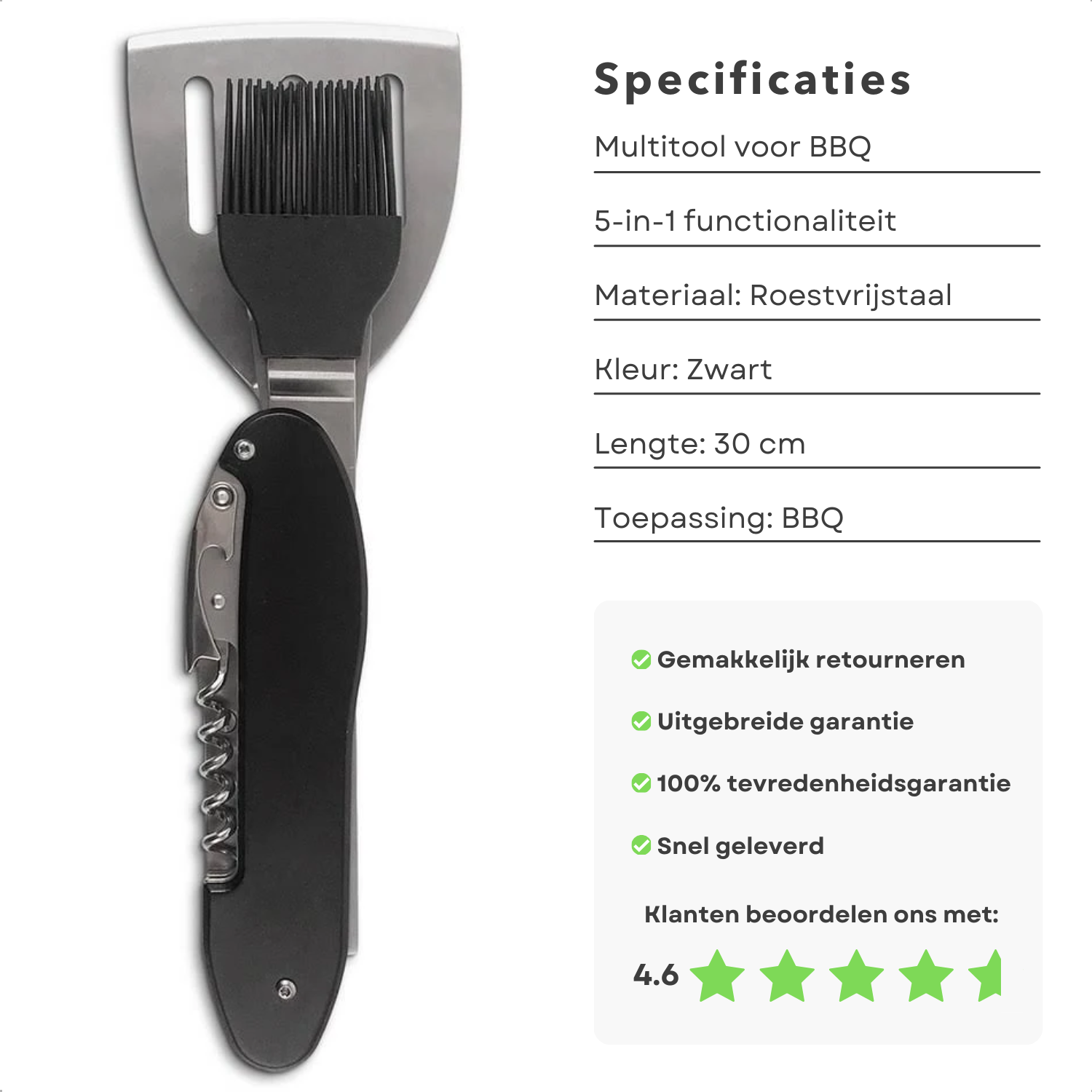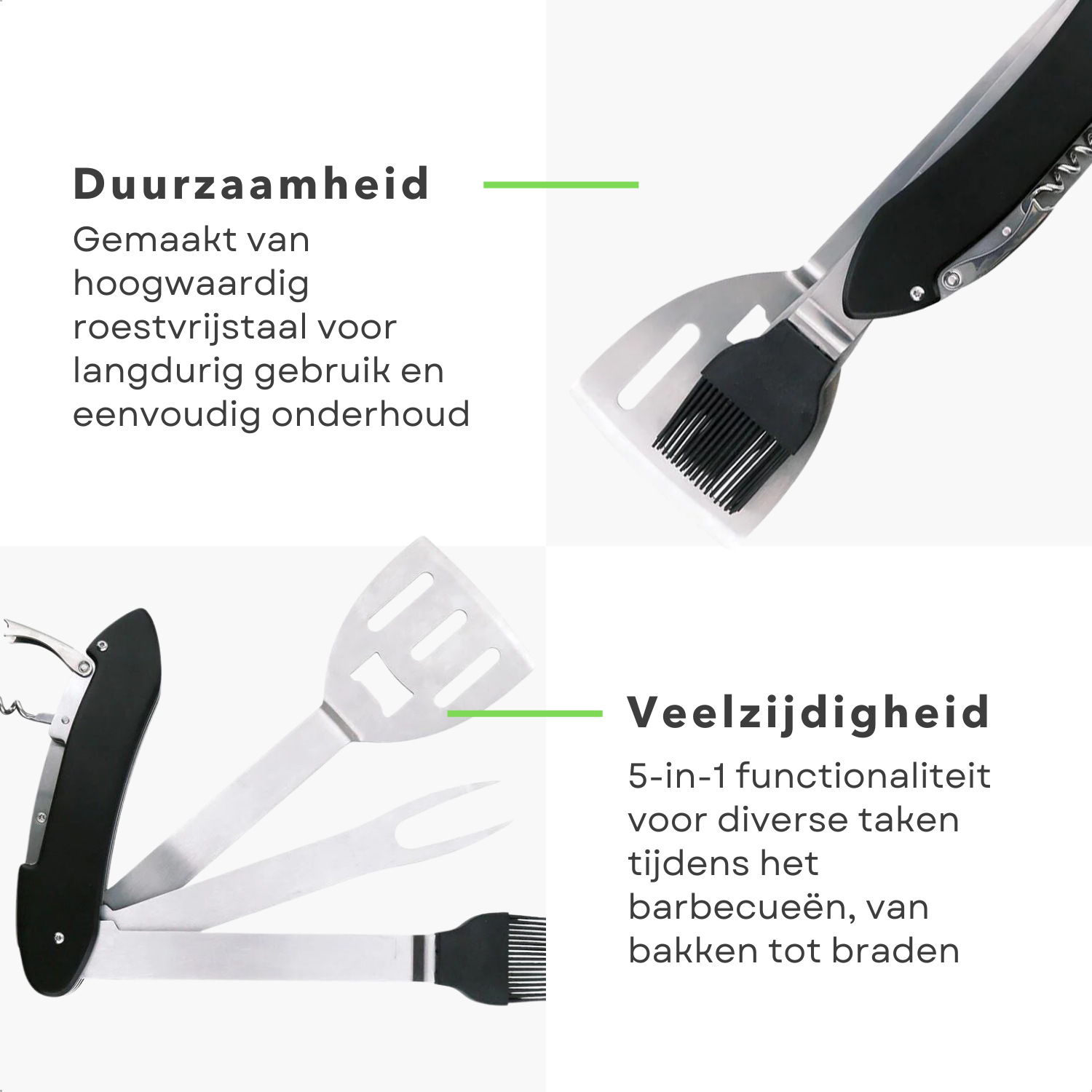 Cheqo® Multifunctioneel BBQ Gereedschap - BBQ Tang - 5-in-1 Barbecue Gereedschap - Grill Accessoire - Handig en Inklapbaar - Groot Model - 30 cm Lang - Marinade Borstel - BBQ Vork - BBQ Spatel