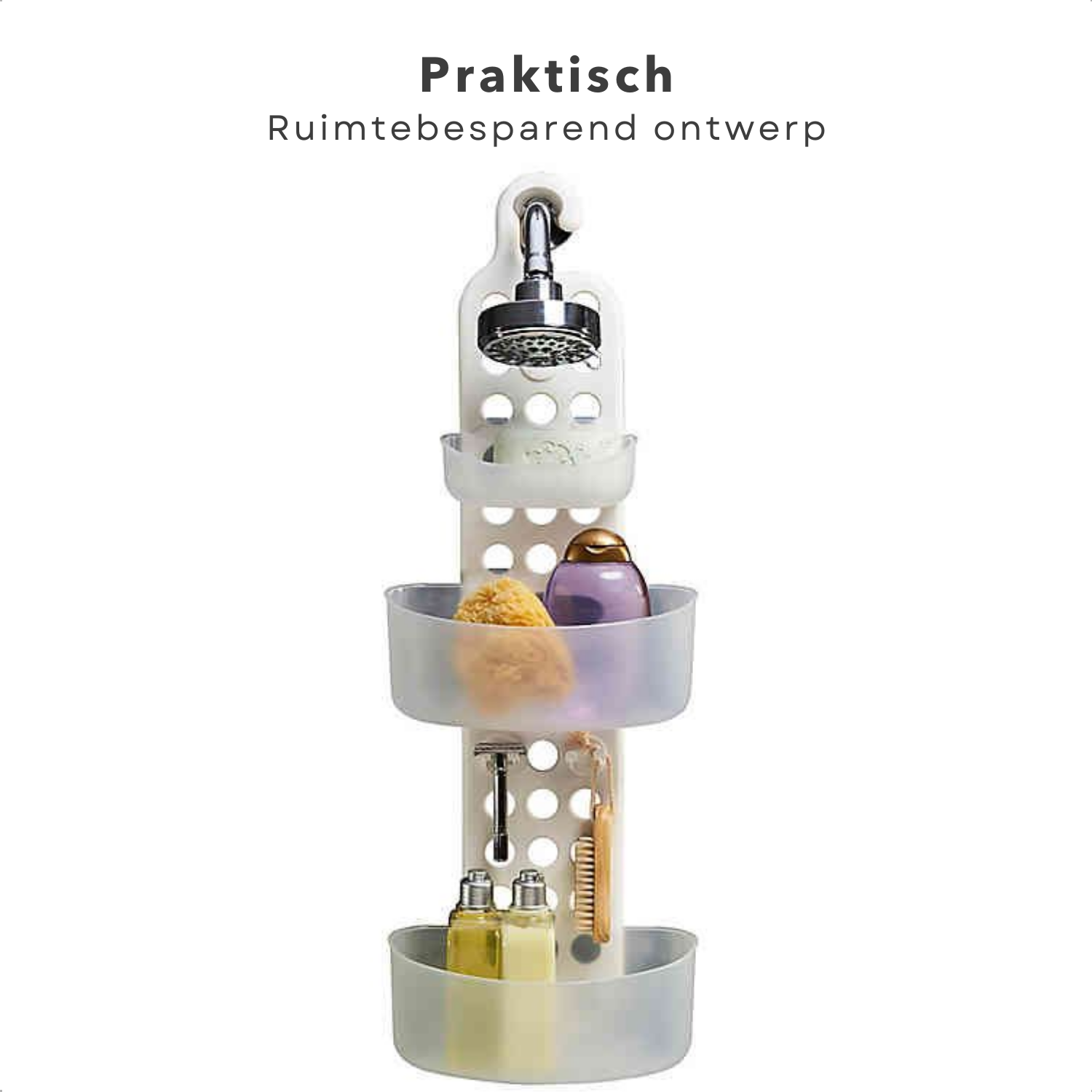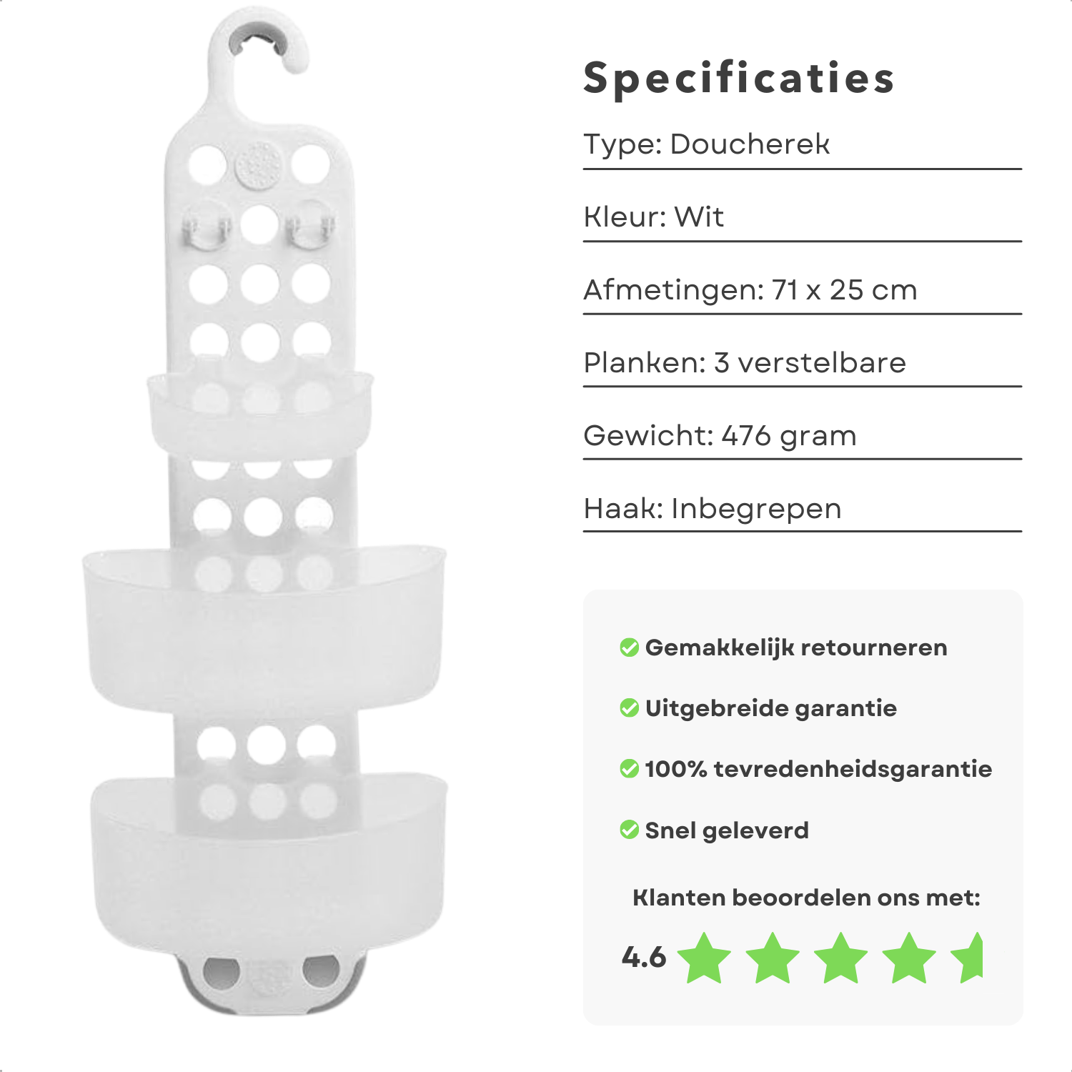 Cheqo® Ophangbaar Doucherek - 71x25cm - Verstelbaar Doucherek - Verstelbaar - Eenvoudige Installatie - Douche Organizer - Doucherek Zonder Boren - Hangend Doucherek - 3 Laags - Douchemandje - Doucherekje - Roestvrij