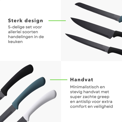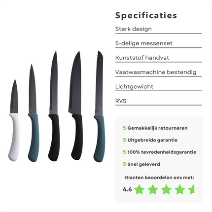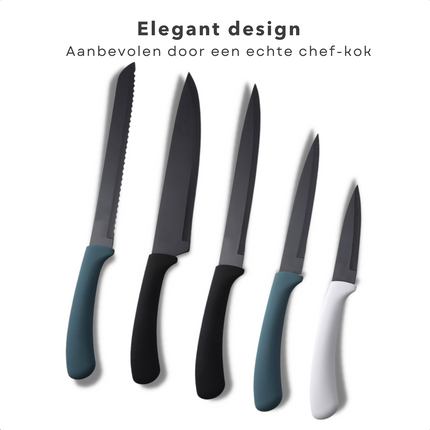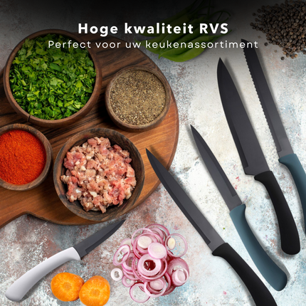 Cheqo® PRO Messenset met Koksmes - Broodmes - Schilmes - Universeel Mes - Snijmes - RVS - Vaatwasserbestendig - Keukenmessen - Koksmessen - 5 Delig