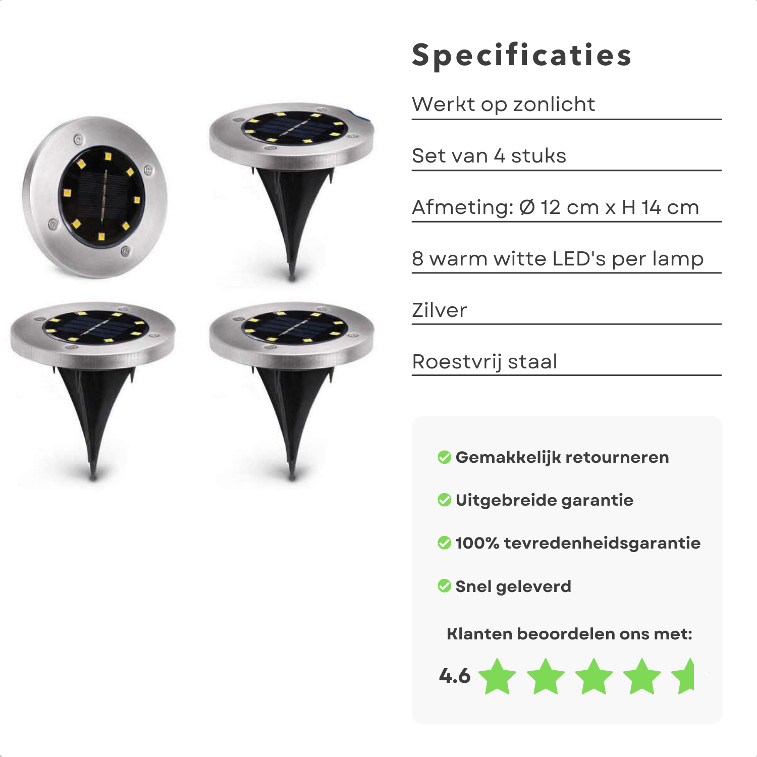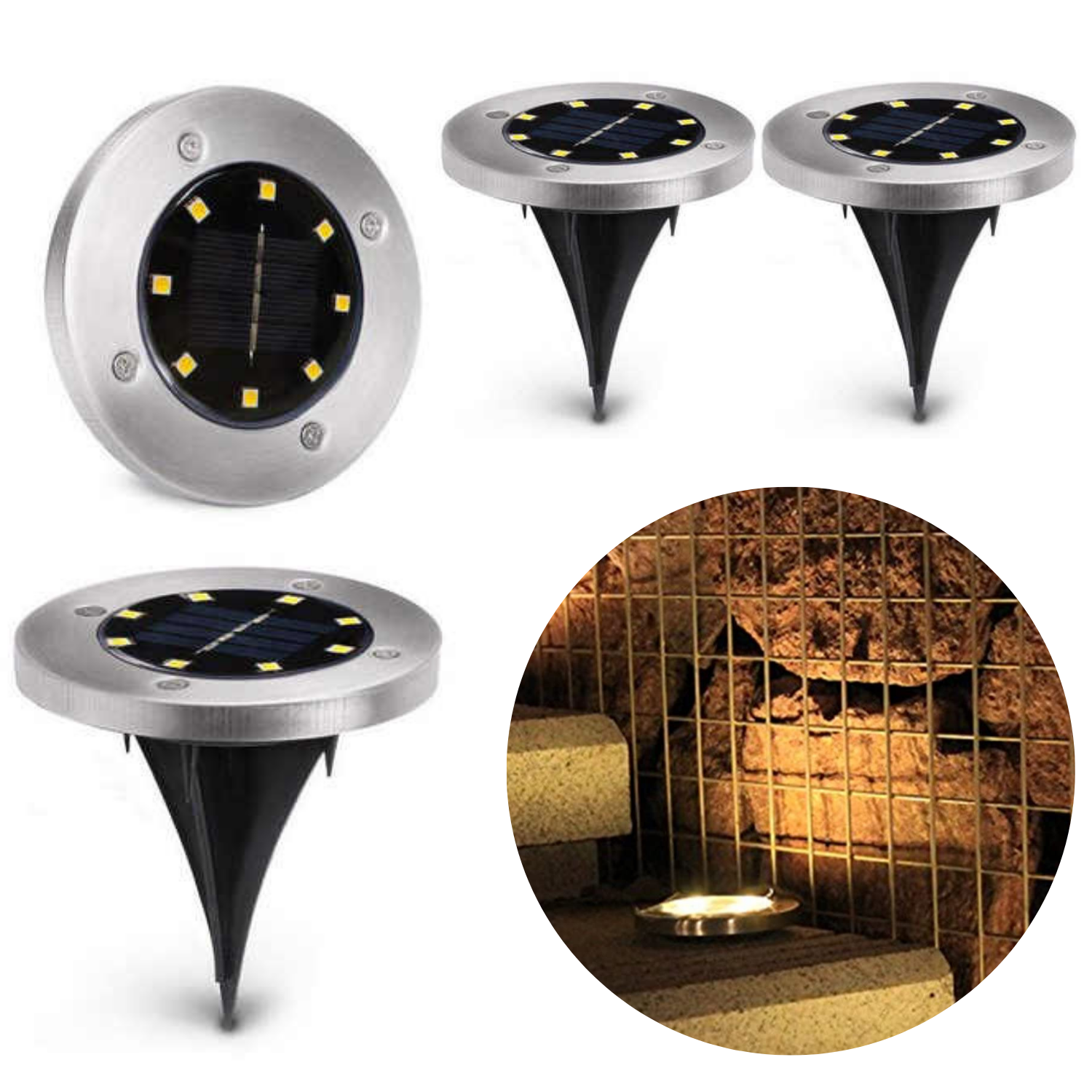 Cheqo® RVS LED Grondspot - Waterdicht - Buitenverlichting - Buitenlamp - Padverlichting - Solar Tuinspot - Tuinverlichting met Zonnepaneel - ø12cm x 14cm - 8 LED - 4 Stuks