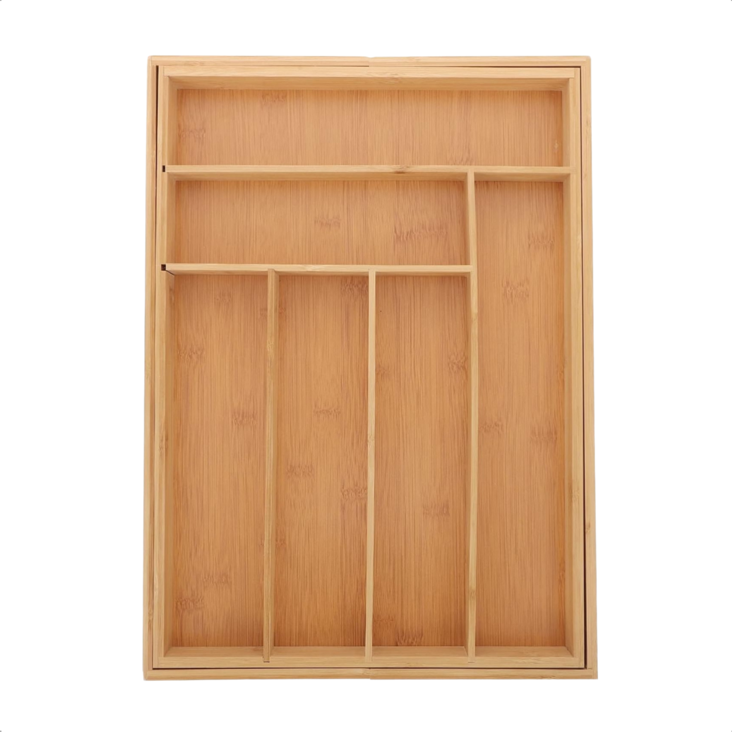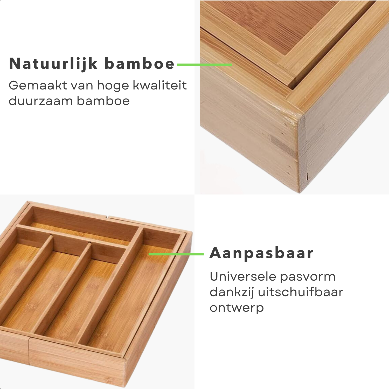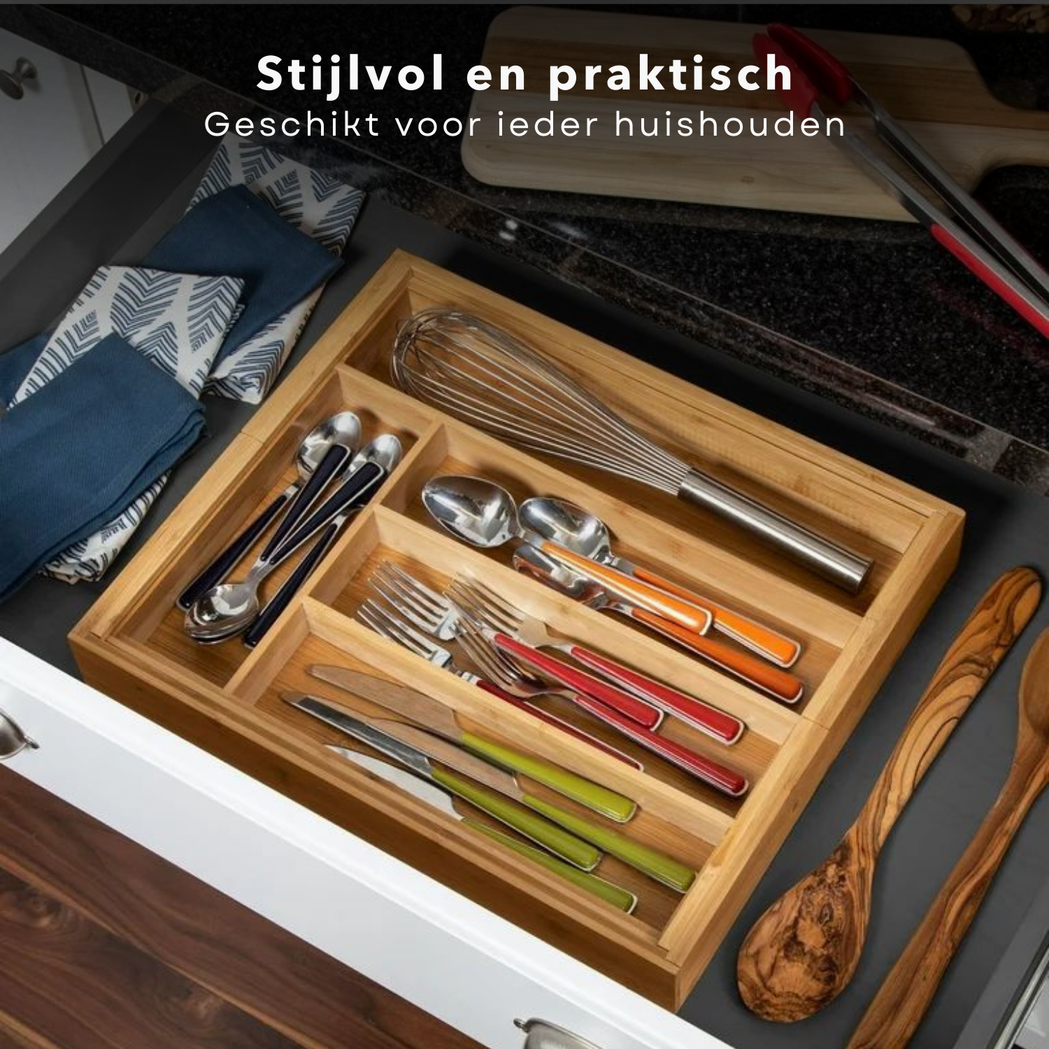 Cheqo® Verstelbare Besteklade - Flexibele Bestekorganizer - Uitschuifbare Bestekbak - 34-56 cm - Vakindeling - Duurzaam Bamboe - Besteklade - 5 tot 7 Vakken - Bestekcassette