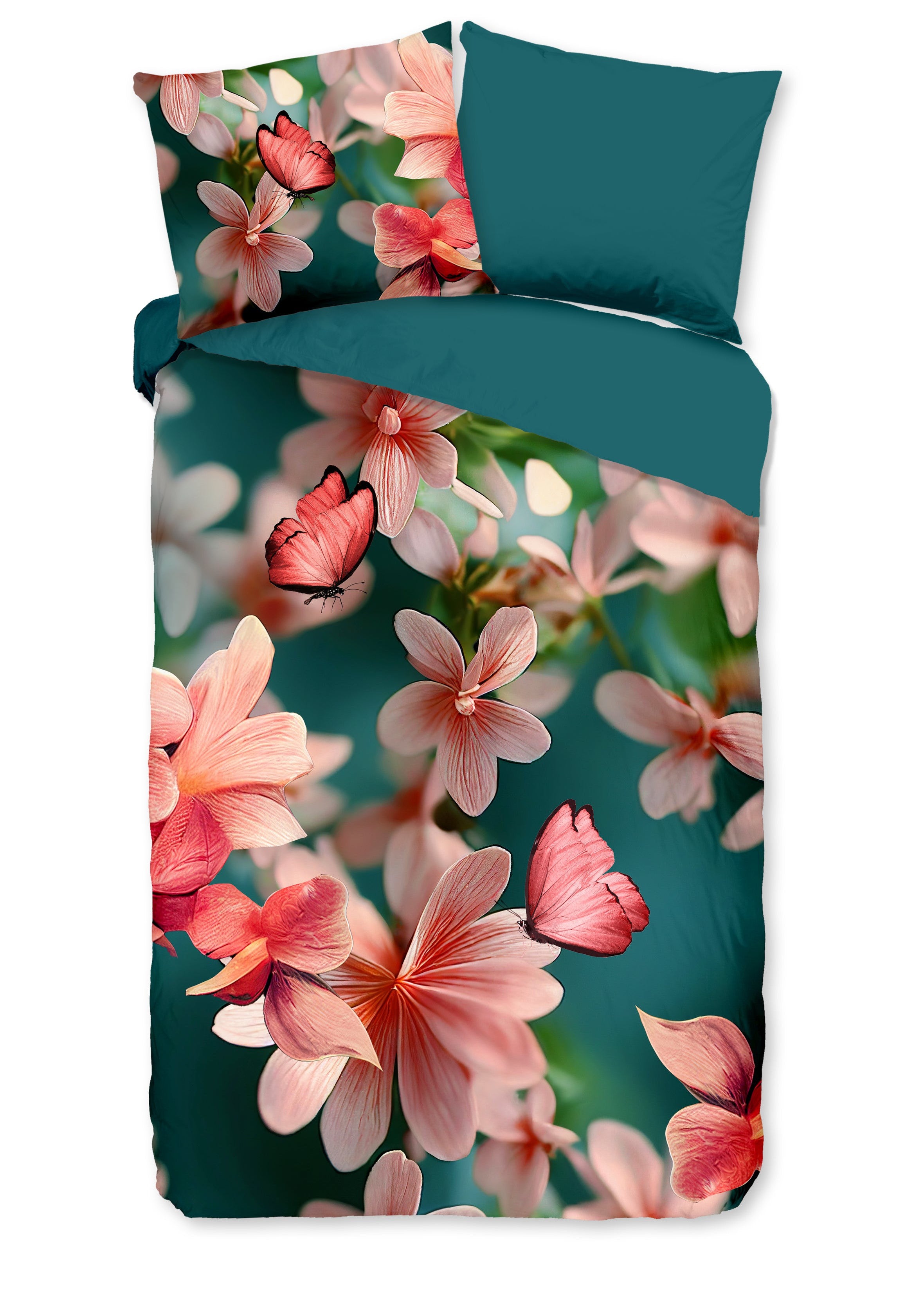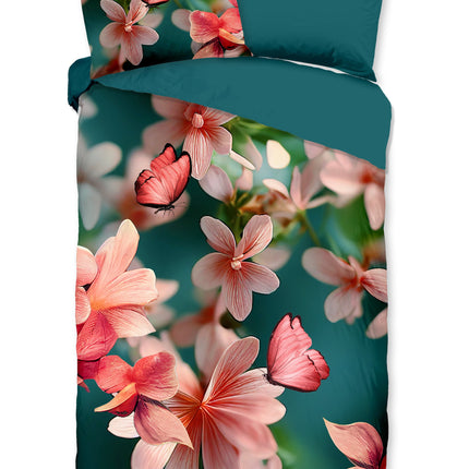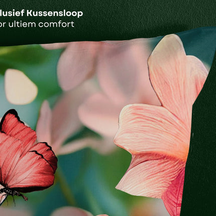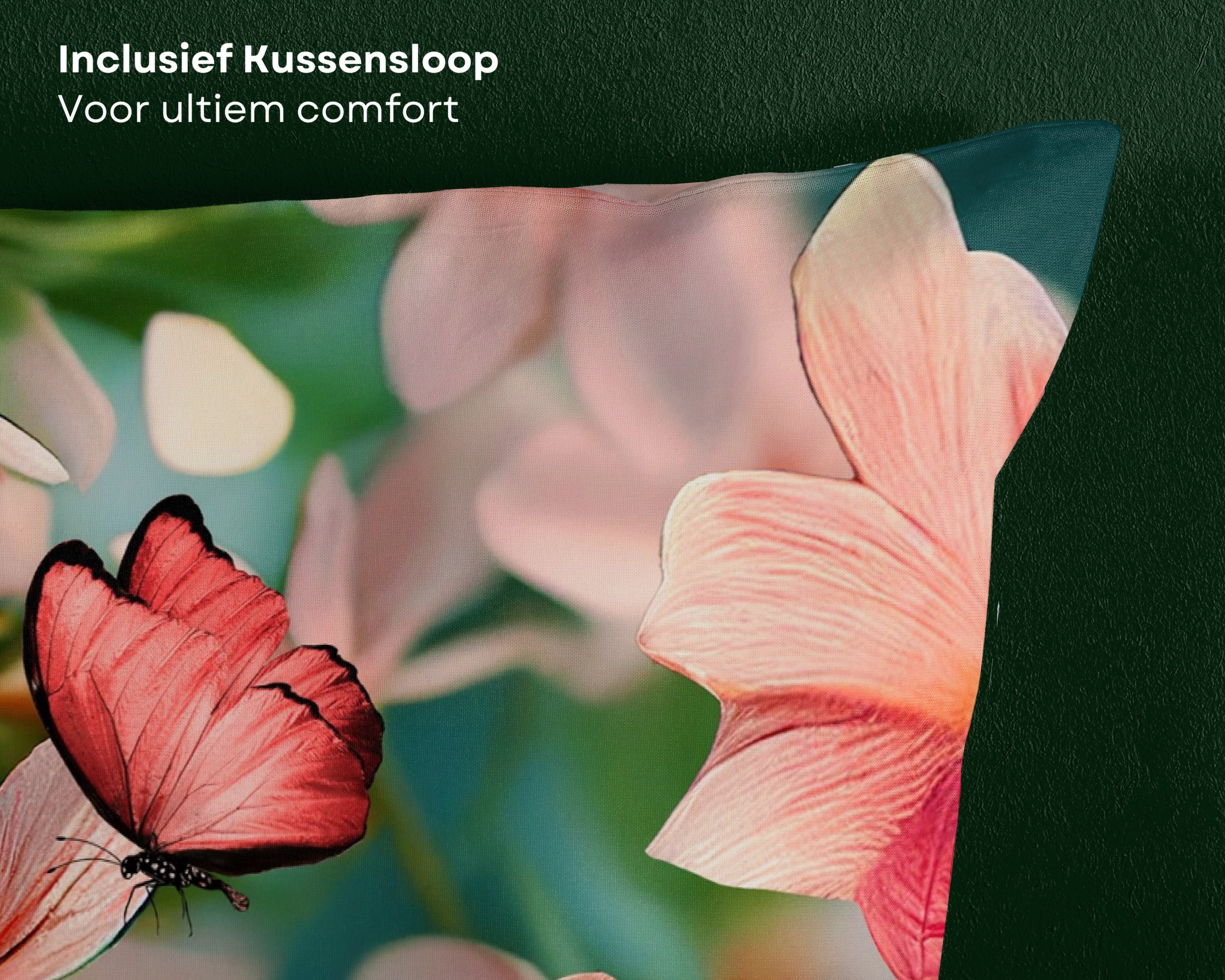 Dekbedovertrek 140x200 cm - Bloemen en Vlinders Print - Roze/Groen - 1 Persoons - Microfiber